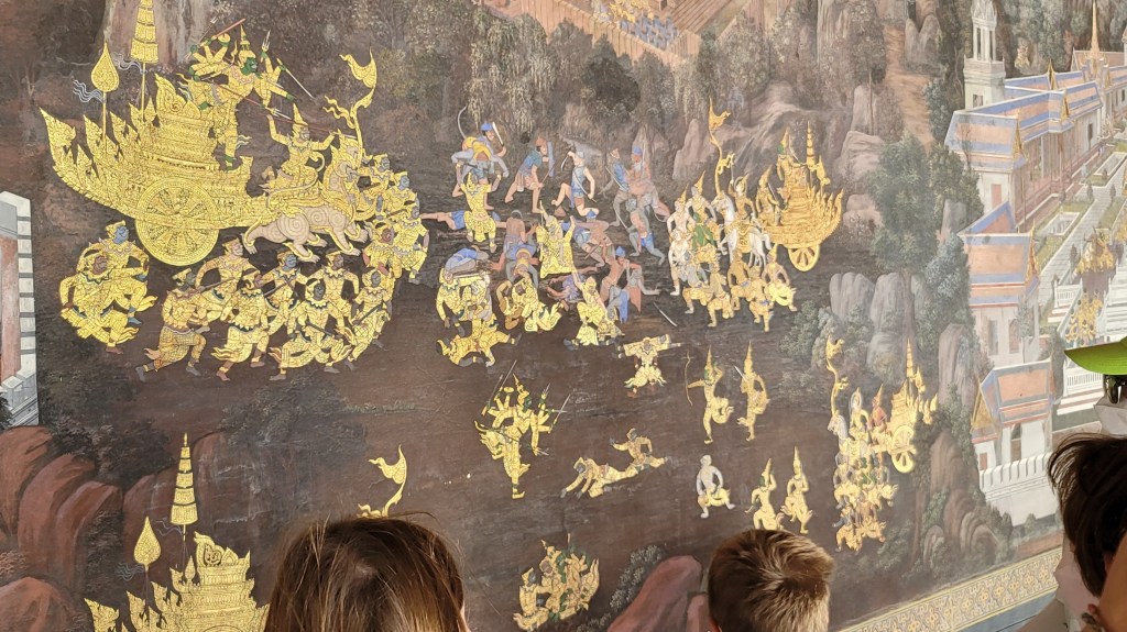 In our case, the Khon was used to dramatize a portion of the Ramakien – one of Thailand’s national epics which we’d just seen depicted on a 178 panel gorgeous mural at the Temple of the Emerald Buddha.