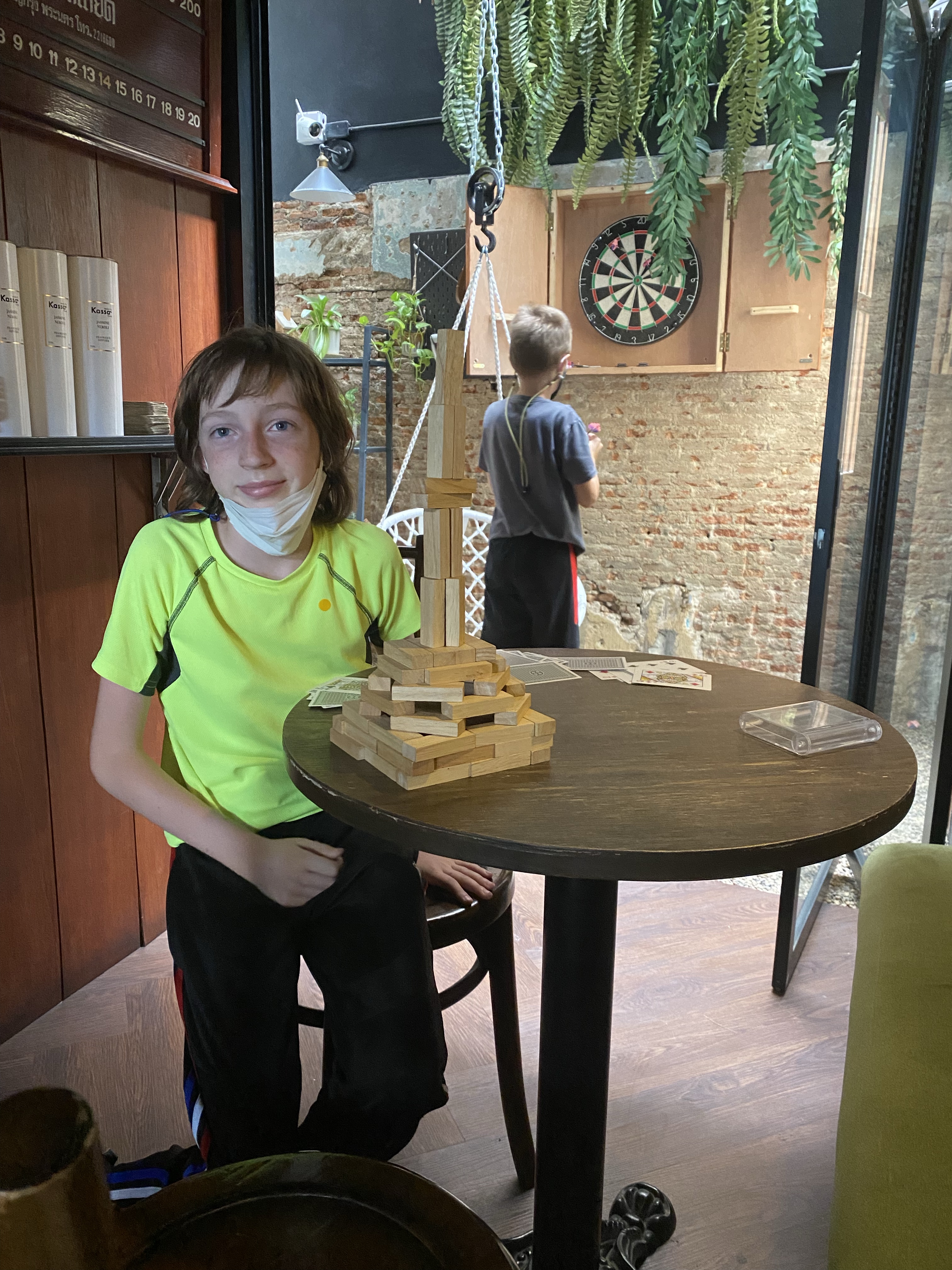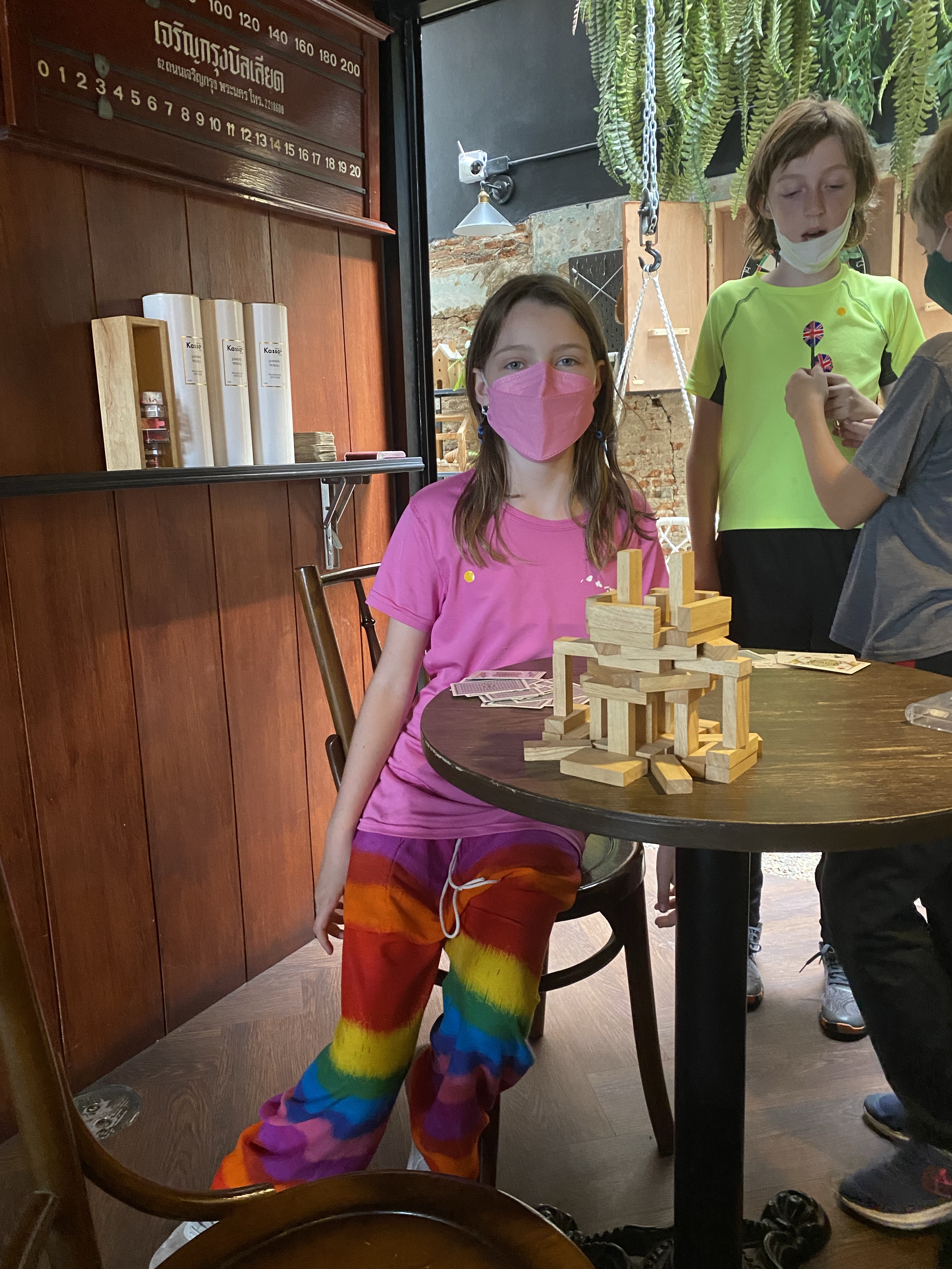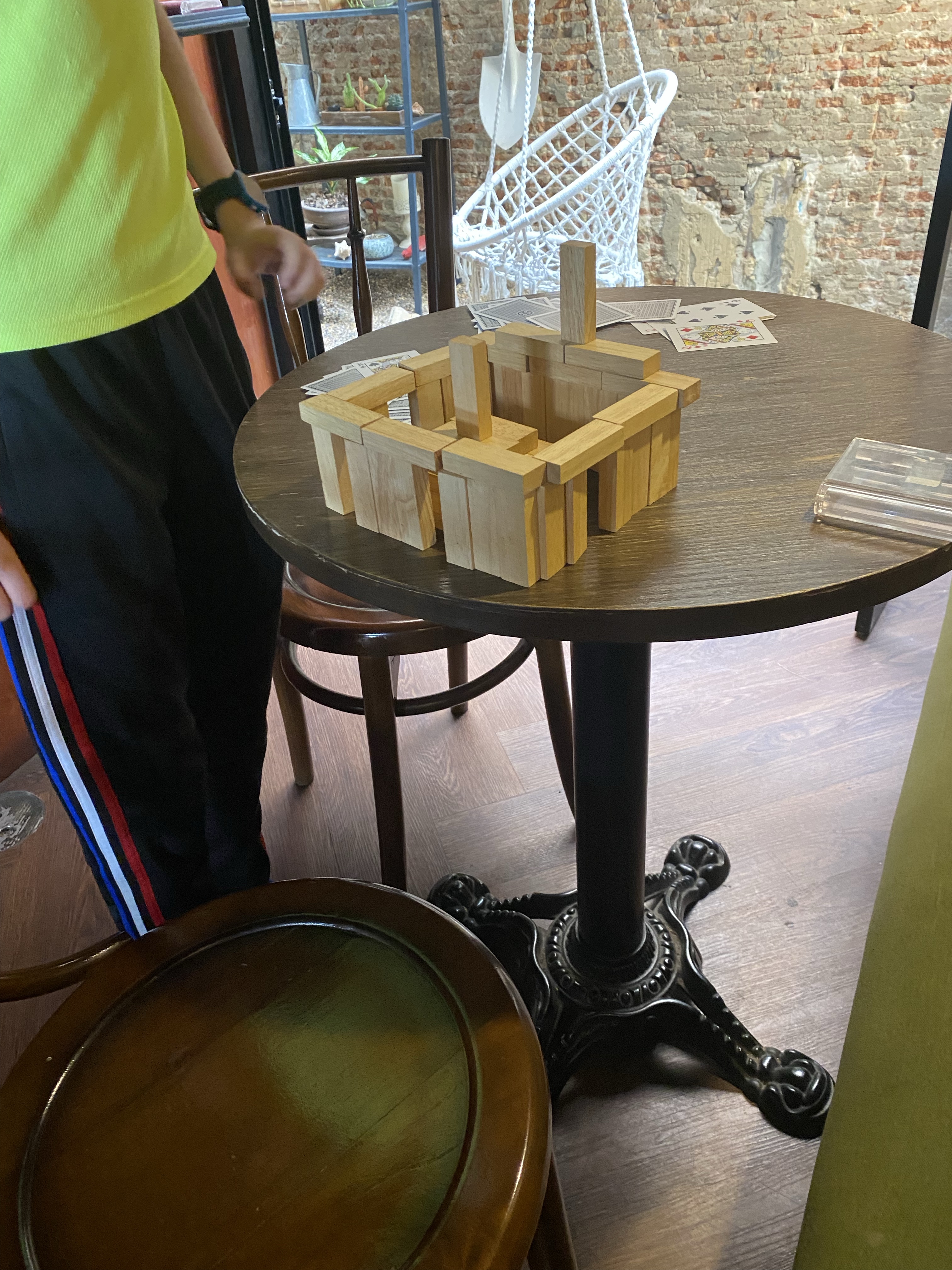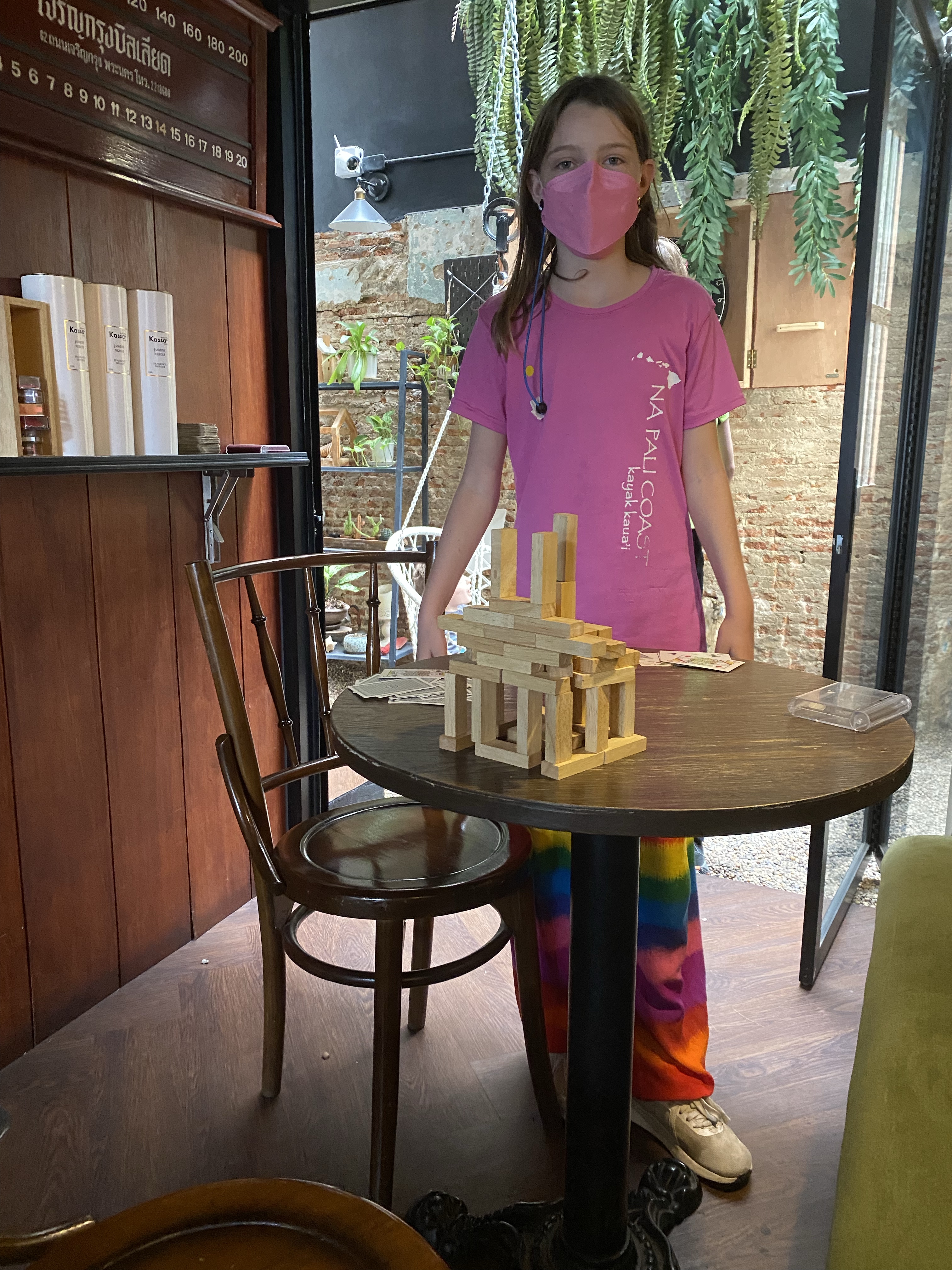 The only negative was that the audience was only about 20 people in a theater that seats 600. The audience, in fact, was a smaller count than the cast members that took a curtain call. After the show we grabbed some lunch at a place with a Jenga set. The kids were so inspired by the day that they started building Wats. They were just as excited about naming their creations as they were about building them.