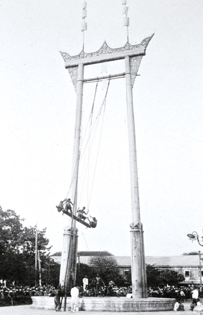 The swing ceremony would pay homage to a Hindu epic with the swing pillars representing the mountains and the base representing the earth. Four men would mount a board tied by ropes to the top of the swing (25m/80+’) and use their body weight to swing the board to ever-greater heights.