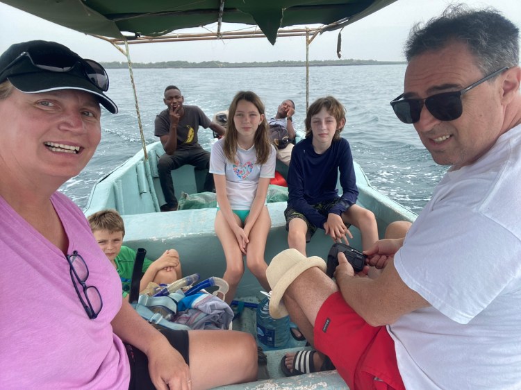 We chose Wednesday for the day of our “Sea Safari”. Our spot was off the coast of Southeastern Kenya to the Kisite Mpunguti Marine National Park. Early this morning we took a one hour drive down to the town of Shimoni and hired a boat and guide to take us snorkeling.
