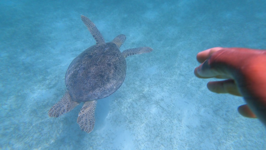 Captain Ali ordered Muhammad to turn around and we went in pursuit of Tiffany’s turtle. We were all rewarded with the some underwater turtle footage after Captain Ali grabbed the GoPro and dove into the water. This was the highlight for most of the kids today. It doesn’t look it but the shell was easily 3 feet wide.