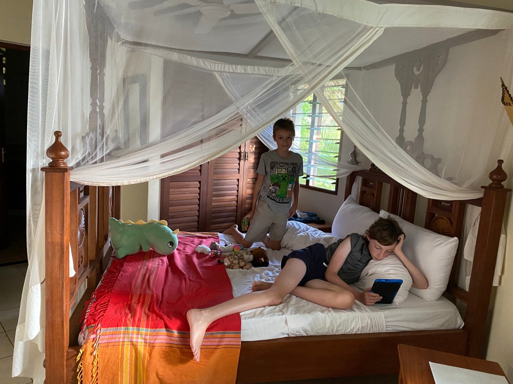 There are three bedrooms and two bathrooms. One has A/C, the others have ceiling fans. The kids got those rooms and are managing, but when nightly temps are high 70s it’s not that fun. The beds are comfortable and they have mosquito nets (a must in Kenya).