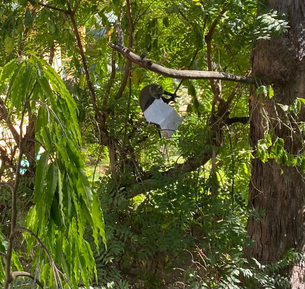 Surely you can guess what happened next. That’s right, the monkey bandits returned and thought the brightly colored cards would be a nice lunch for them!