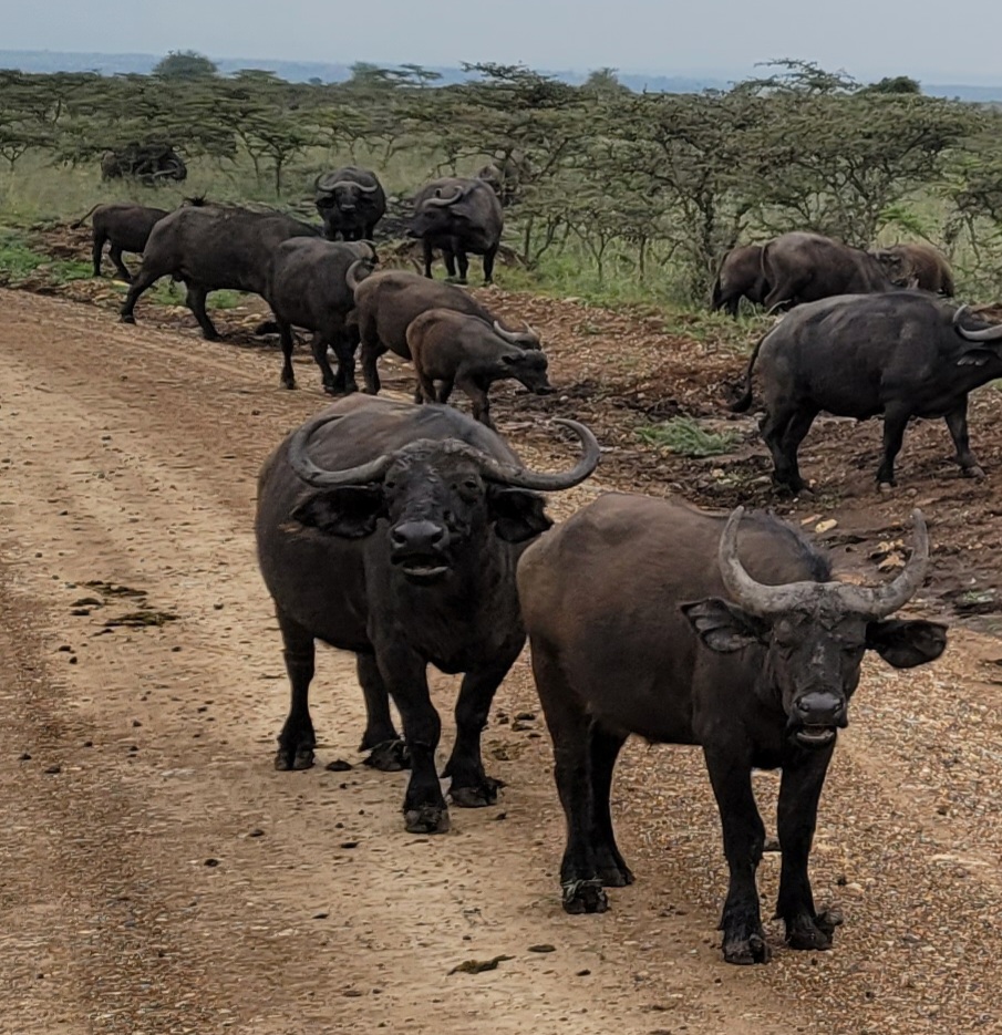 More roadside wildlife appeared as we entered the park itself. These water buffalo were closer to us than any we had seen in Masai Mara or Amboseli. We had to move them along simply to proceed on the road. They weigh as much as a cow and a half.