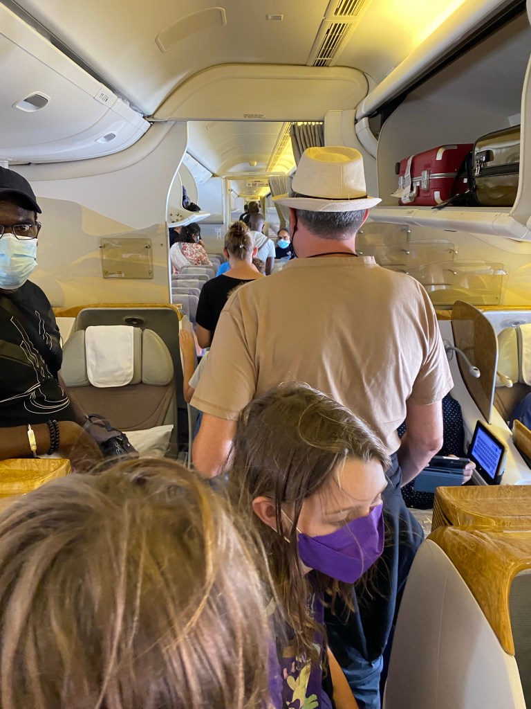 Then after you check in and check bags, you go through a second TSA type security – laptops/tablets out, shoes off, body scanner etc. With five of us all carrying devices we are chaos personified. Bins flying, stuff everywhere. The kids are getting better as they do it more frequently but we still often hold up the line – a rub to the former ‘road warriors’ in the family.