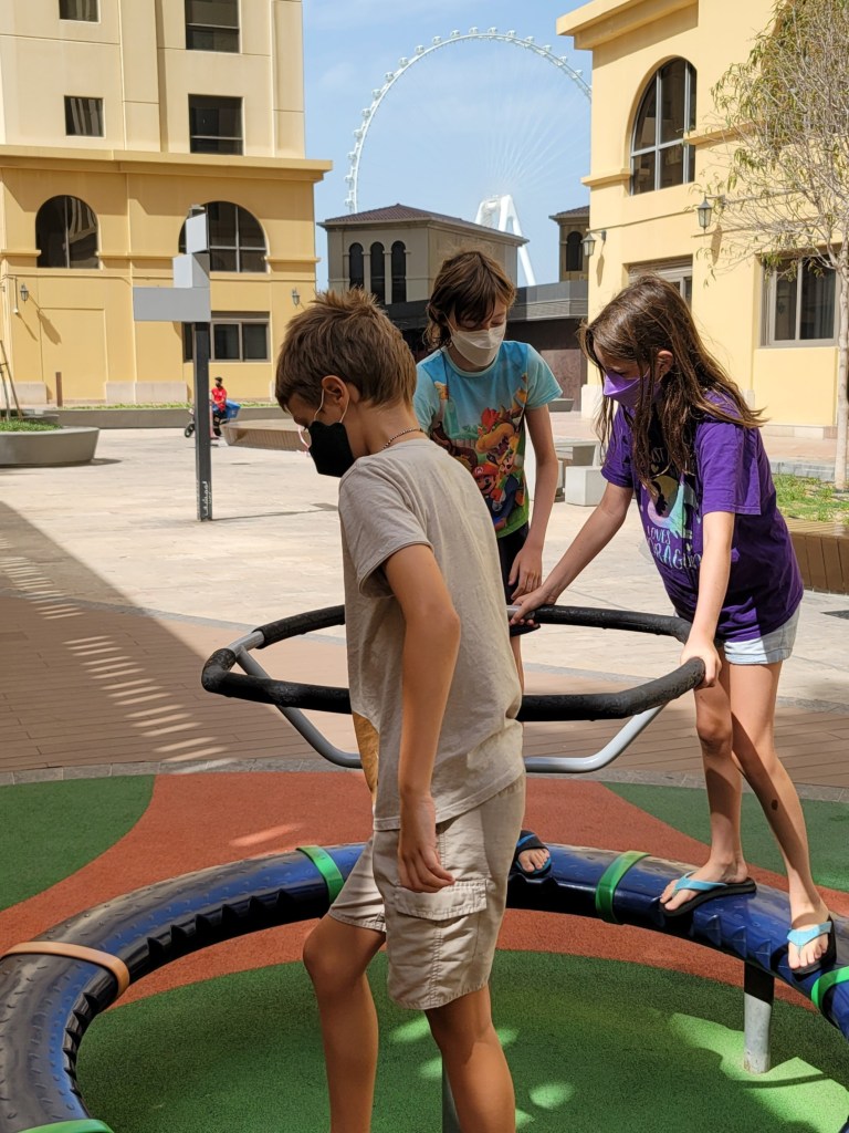 There are many tall buildings throughout Dubai and a number of them are residences and hotels. There is a common plaza between these buildings elevated from the street level. There are also fun touches like in ‘ground’ trampolines and small climbing structures that the kids enjoyed.