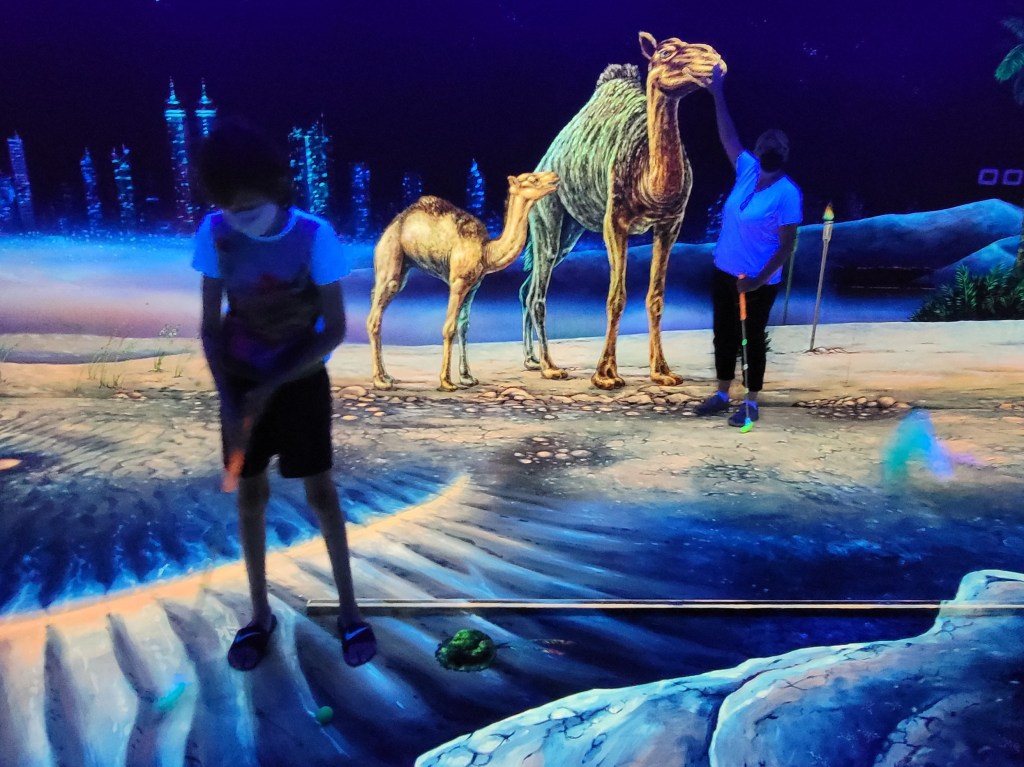 With our tail between our legs, we let the kids pick the next item on our to do list. During our morning exploration we spotted an attraction which is a constant obsession with them so no surprise they picked it. This specific iteration combined an obstacle course, blacklight, lowest-score-wins, and silly glasses. That’s right…the choice was 3D Blacklight Mini-Golf!