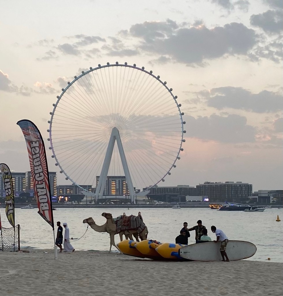 After that we took a walk up toward the Palm Jumeirah to check things out. A key landmark that can be seen from many spots in the Marina area is the Ain Dubai, the world’s tallest observation wheel. Today, we were treated to a sunset through the spokes.