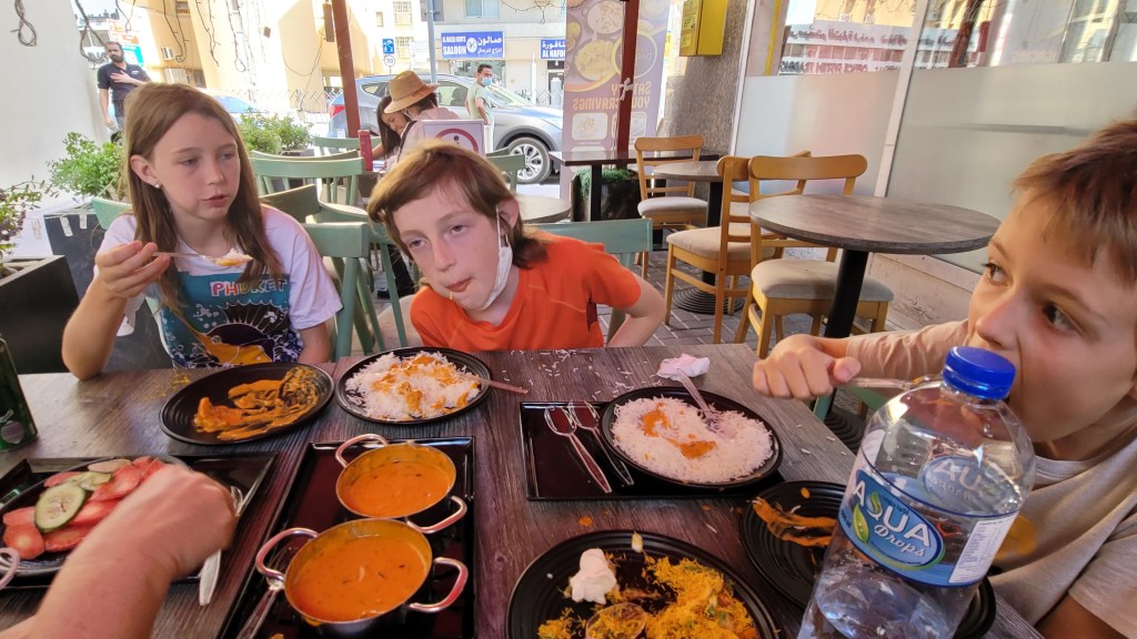 We had a good experience on public transportation yesterday so we took it again today to the meeting point for the tour. It’s an elevated train so we passed by some very cool high rise architecture on the way including our old friend the Burj Khalifa. We grabbed a quick bite to eat (Indian food) and were off to meet our guide.