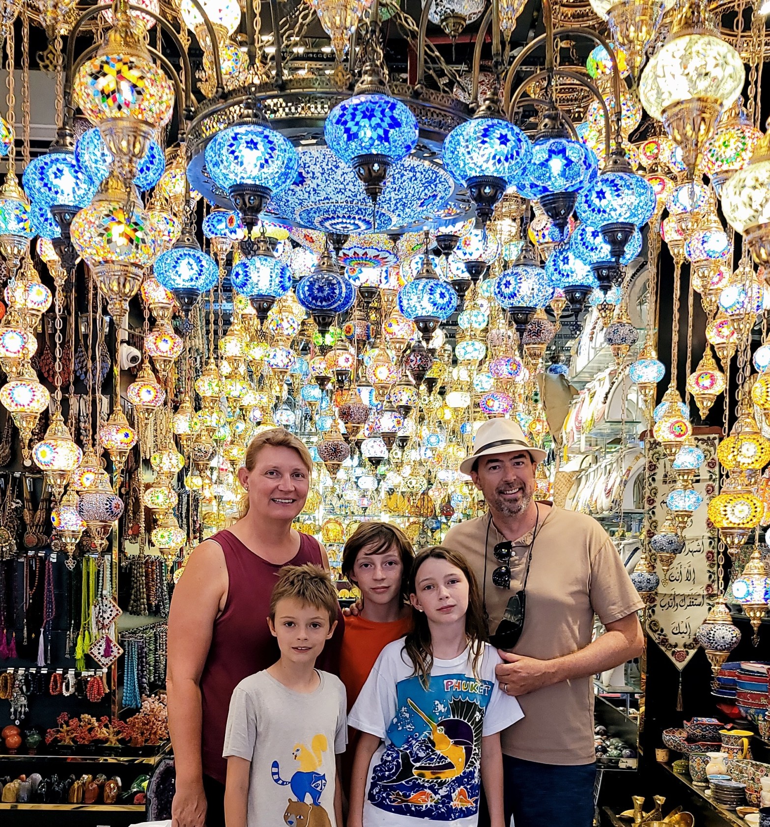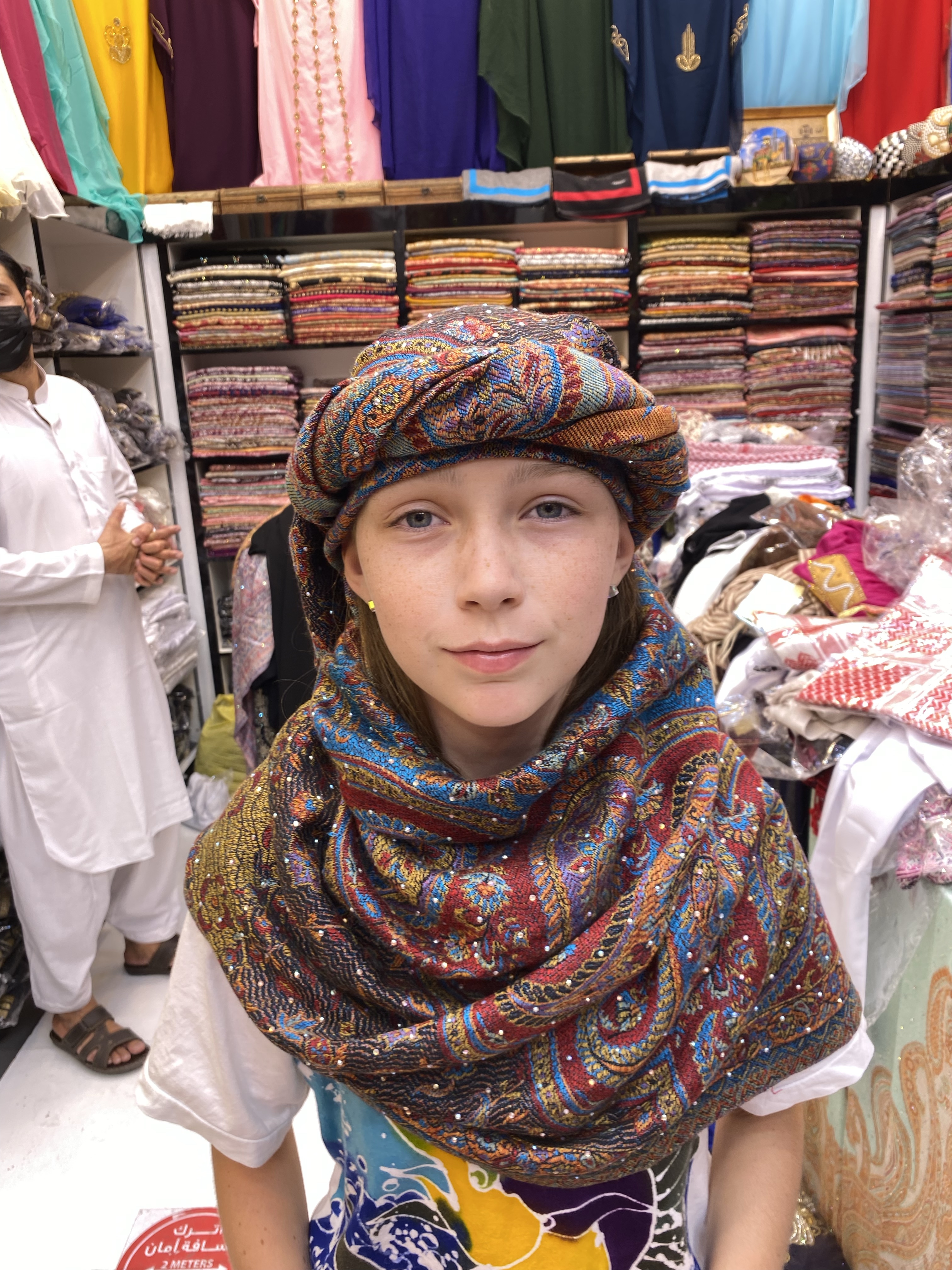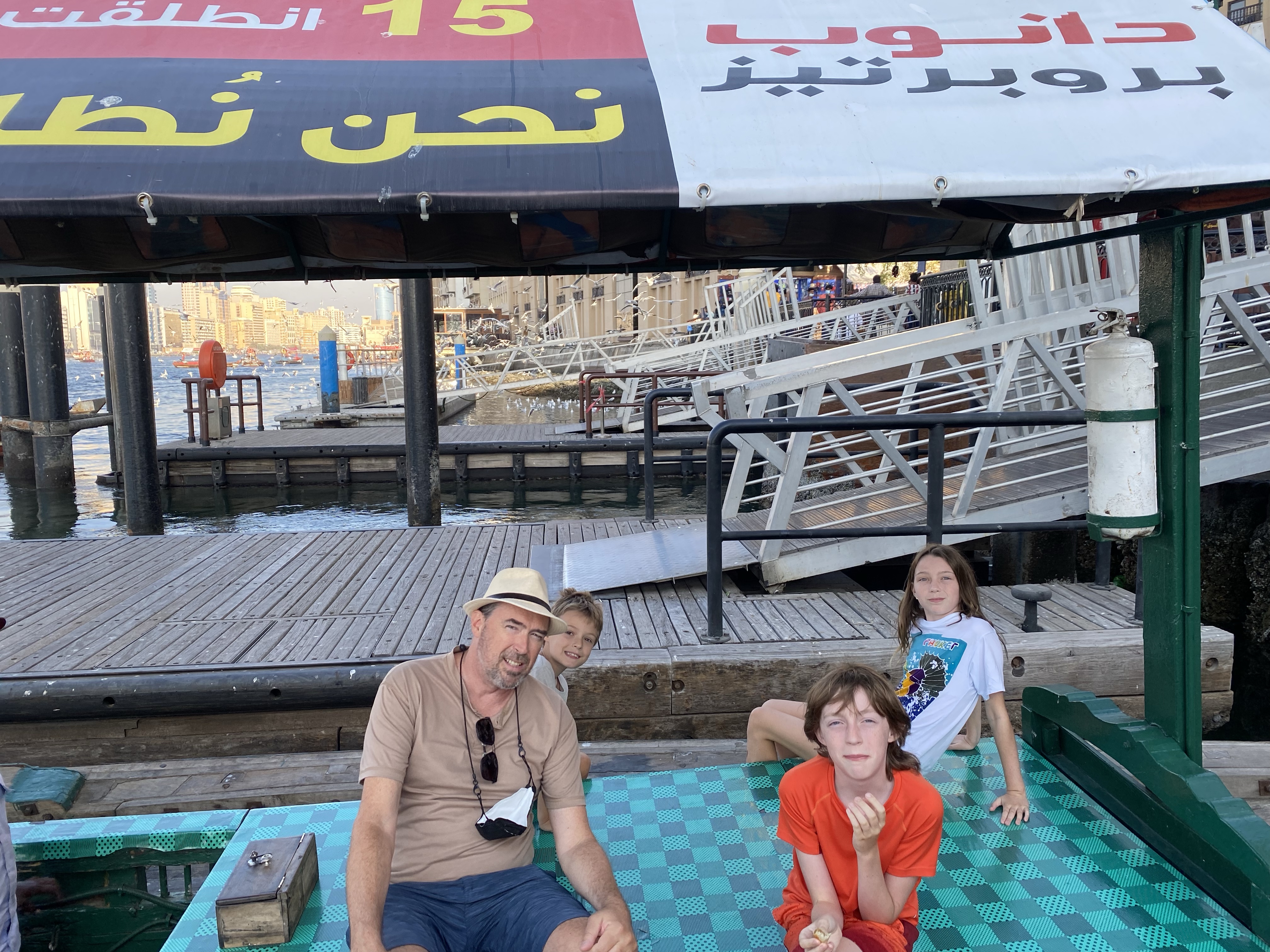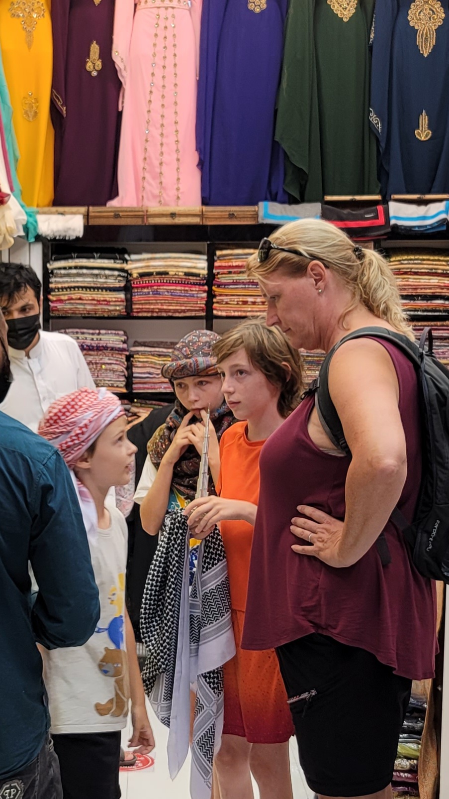 After purchasing a few souvenirs we caught our own boat across the river headed for the spice souk (market). It was wonderful and made us wish we were going straight home so we could have stocked up. We learned how to tell high quality saffron from counterfeit (high quality floats and turns water yellow, counterfeit sinks and turns water red). The kids got to try some traditional scarves and camel milk chocolate. Some of the chocolate came back with us as well as some fragrant mango herbal tea that smelled just heavenly.