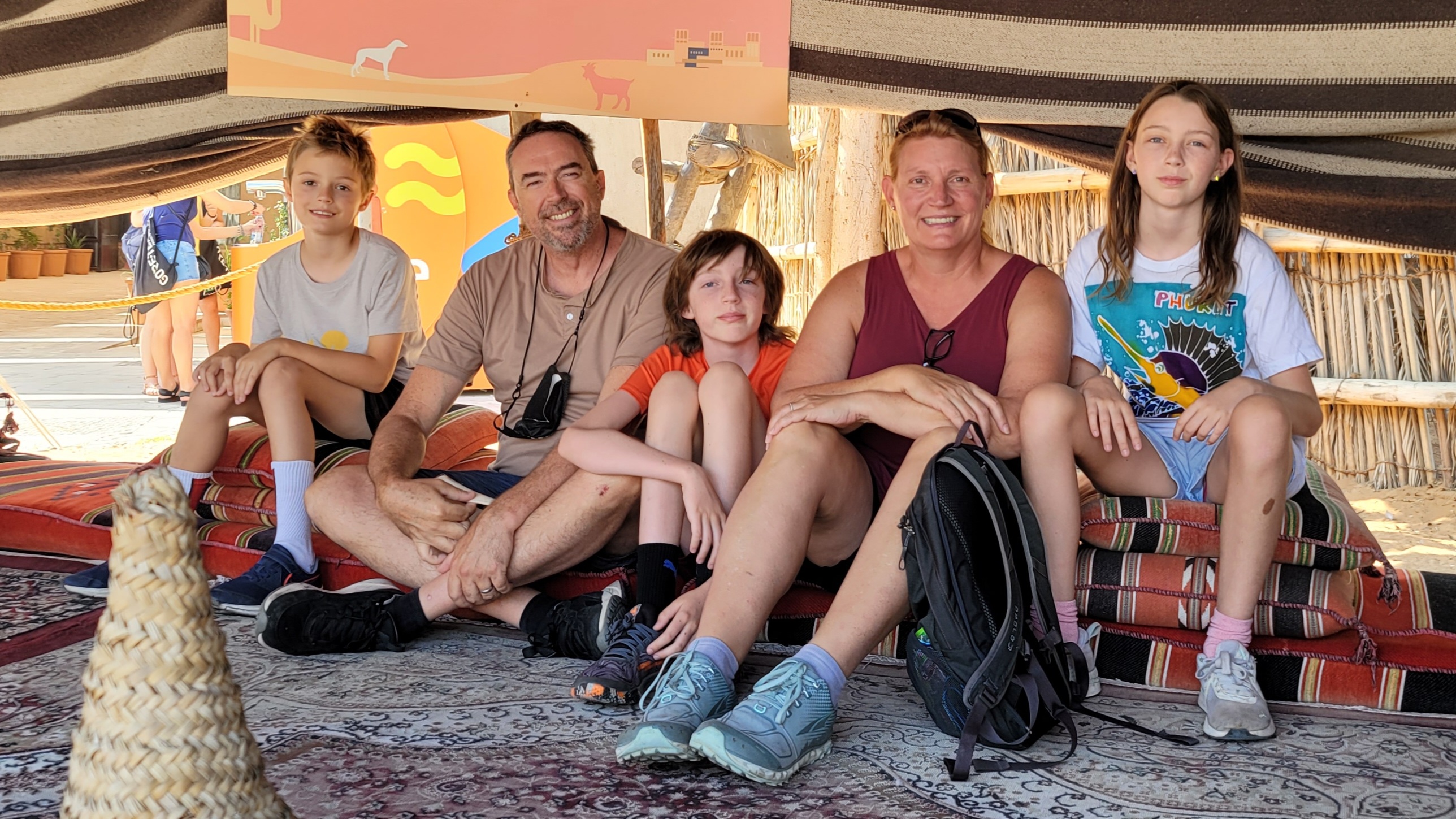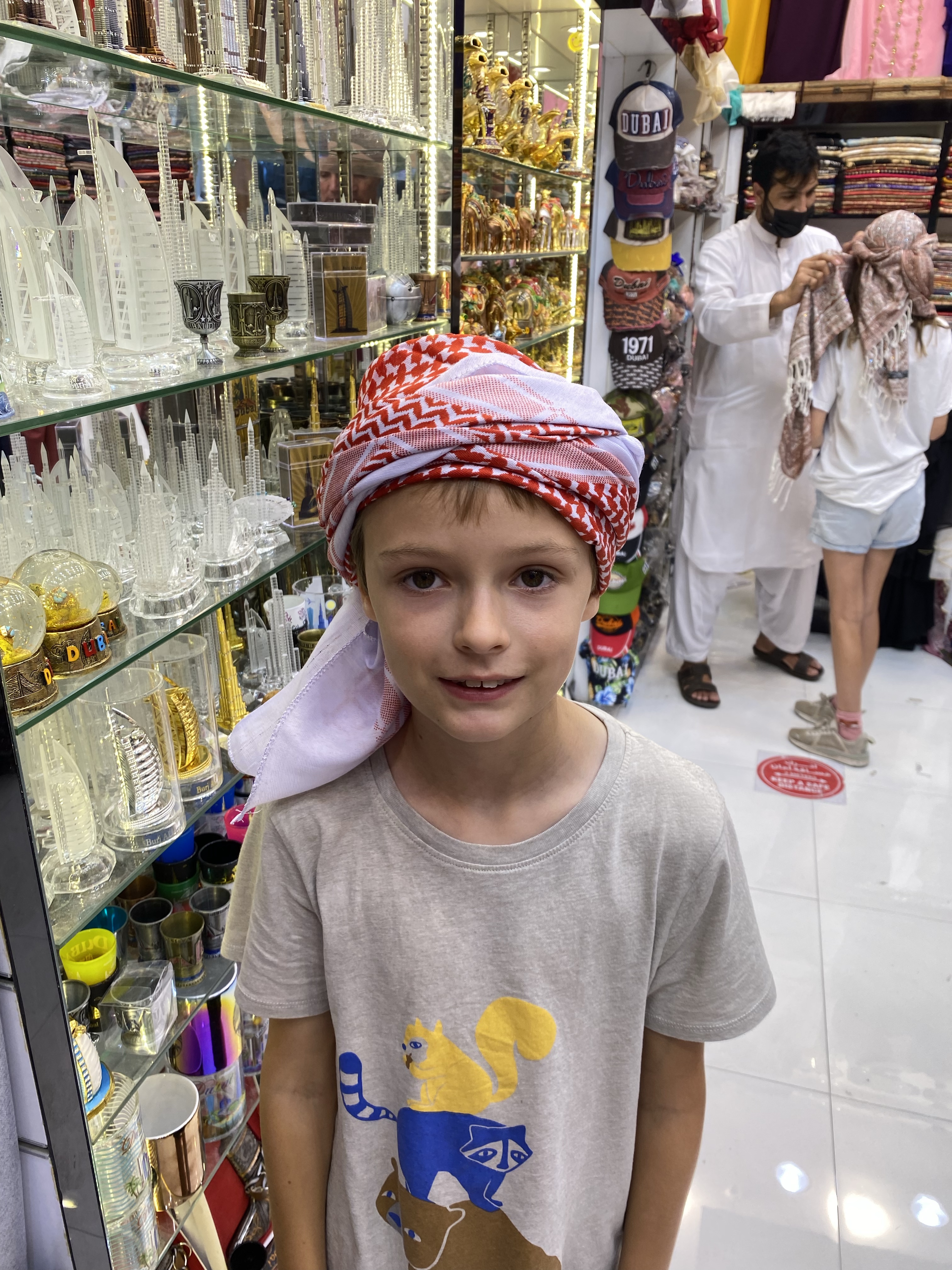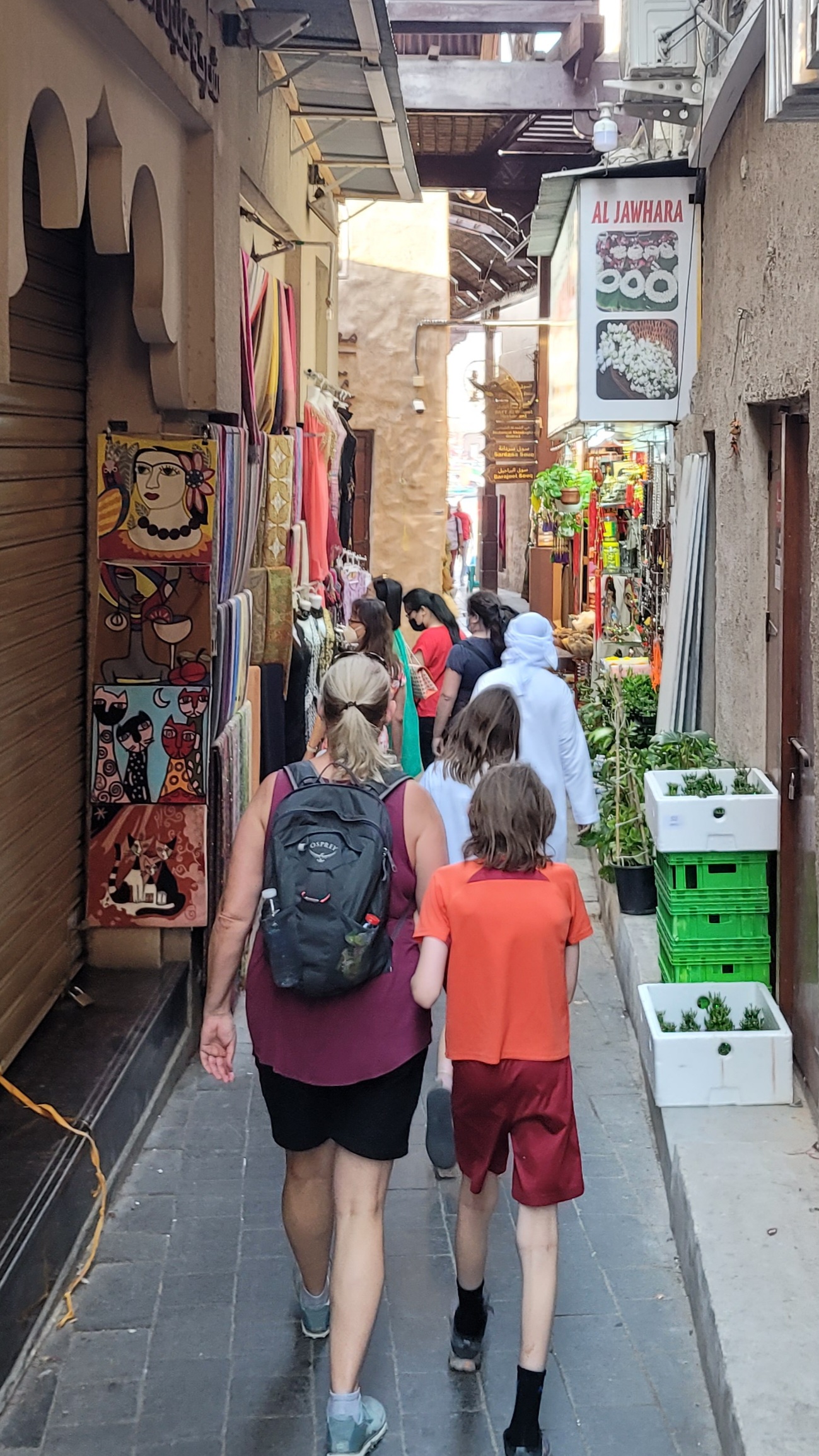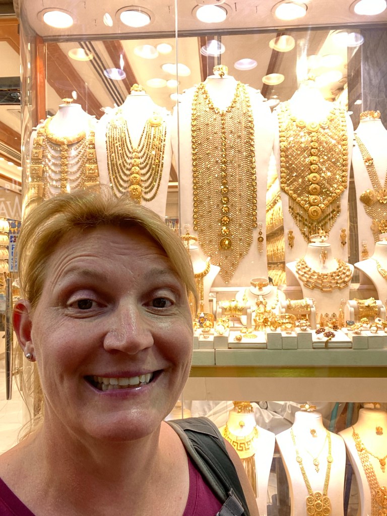 Our last stop was the world famous Dubai Gold Souk. It’s one of the largest gold markets in the Middle East (the world?) with over 350 shops selling all manner of gold jewelry. It’s traditional the men buy gold jewelry for the women, so the kids picked out something they thought Dad should get for Mom. That one in the middle looks nice.