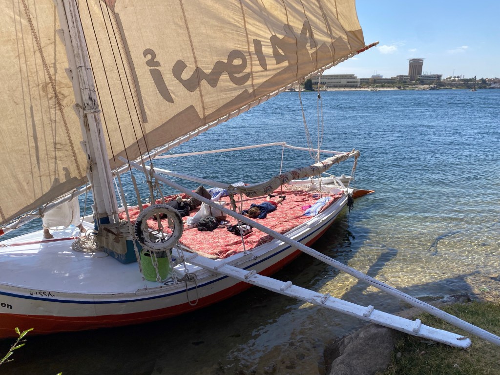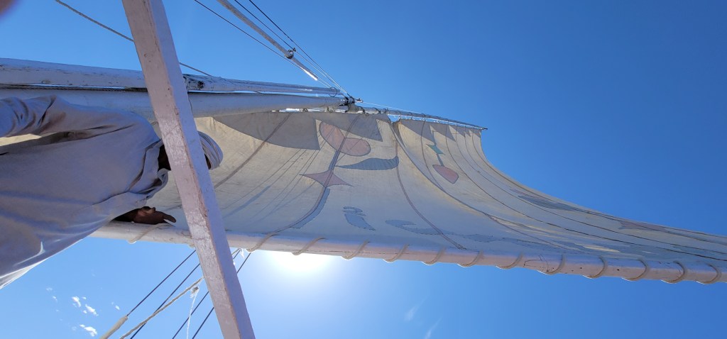 We didn’t pick that option, instead we chose a more ‘traditional’ Adventure. Our journey down the Nile is on a felucca, a wooden sailing craft native to Egypt and the Mediterranean. They have been used by Egyptians, Greeks and Romans since antiquity. Today they are primarily used for tourists like us.
