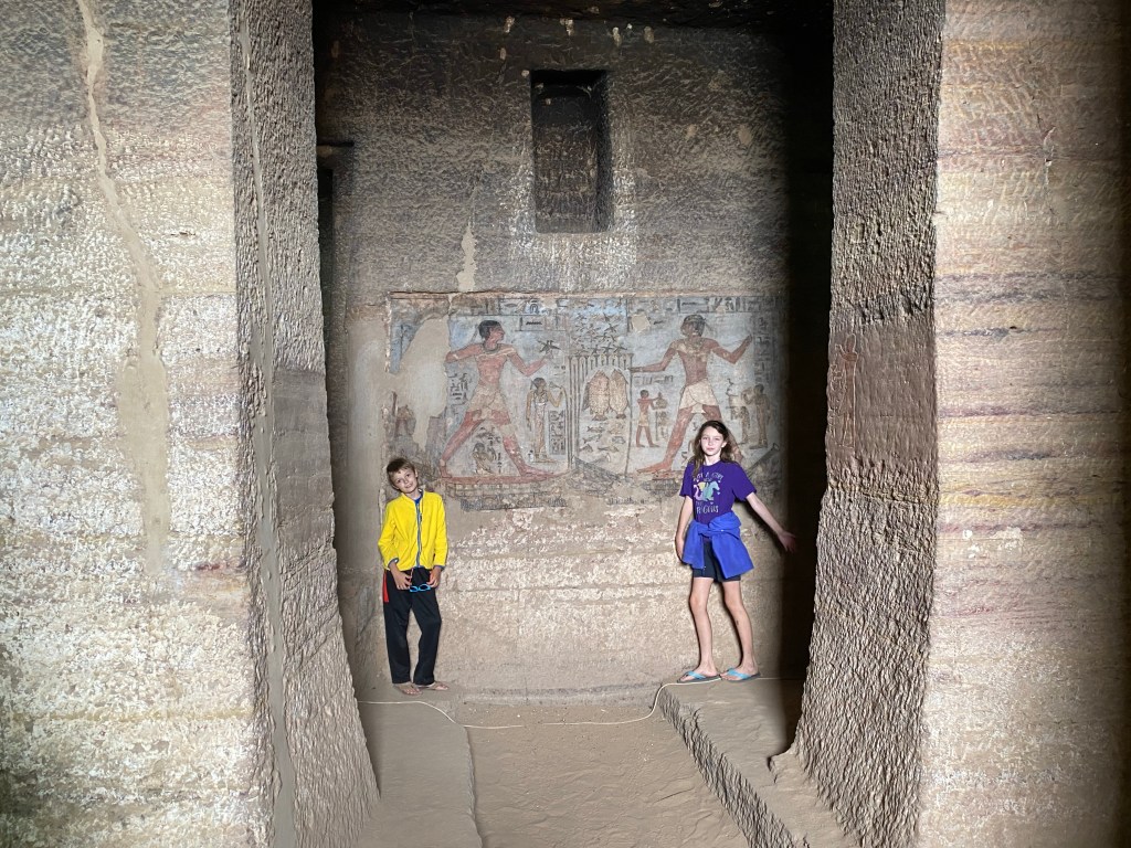 During our 3 hour lunch/wait for favorable winds, we saw 23 of the cruise boats headed north past us. Most looked pretty empty but they are on their way to Luxor. We’re doing an electronics free day on the boat (other than pictures and the post) so the kids are finding ways to entertain themselves. CreeperKitty spent about 30 minutes hitting sticks with other sticks.