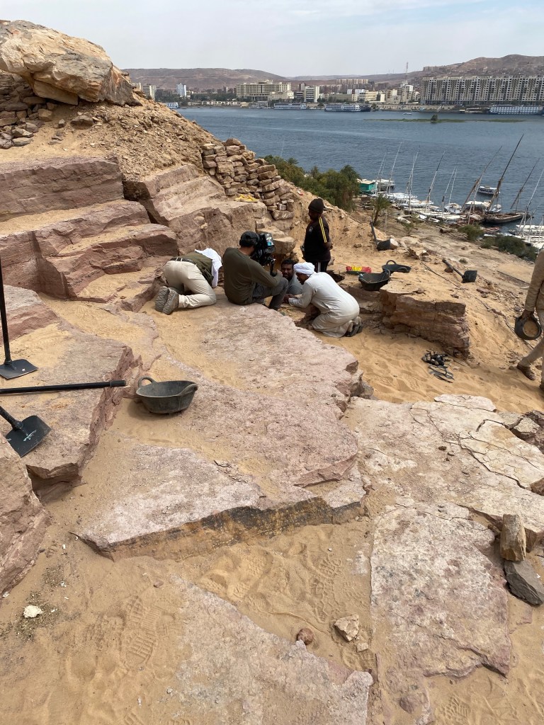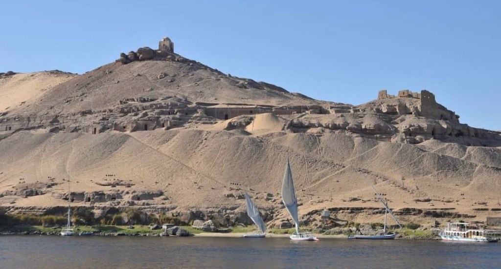 The strong wind that is straight into our face as we head north isn’t very favorable for our smallish boat so we take it slow. Our first stop was about 1/4 mile down and across the river. At the top of the hill was the Tombs of the Nobles, a 13th century honeycomb of entrance hall, pillars and burial chambers.