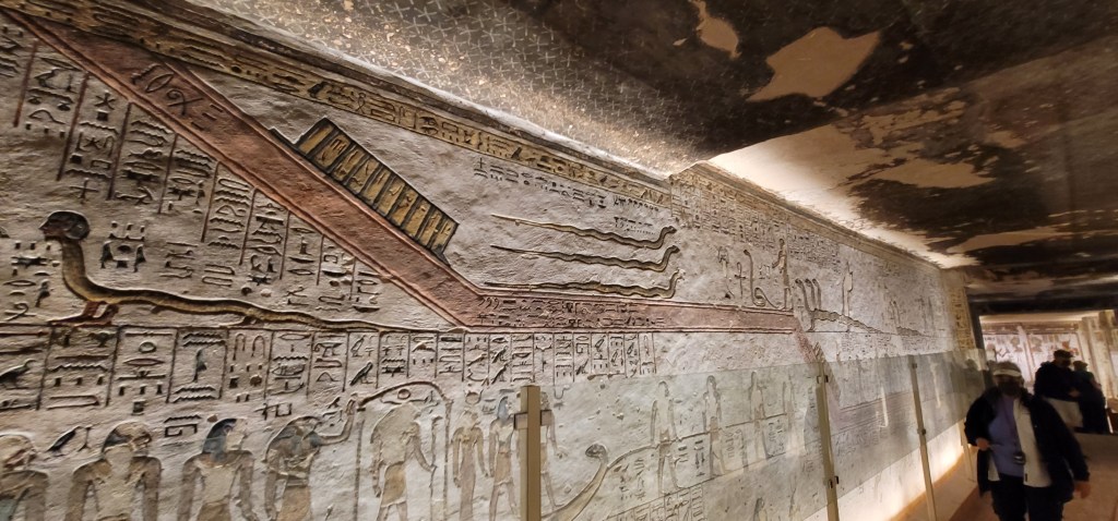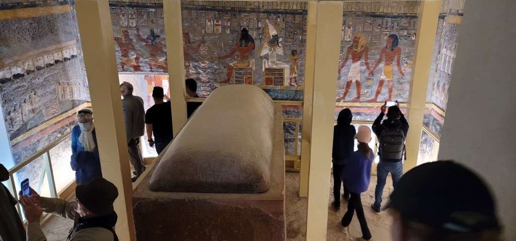 Instead we started with a tomb for the Pharaoh Merenptah, Rameses II’s son. It was a steep walk down 475 feet to the burial chamber using a wooden walkway constructed as part of restorations.