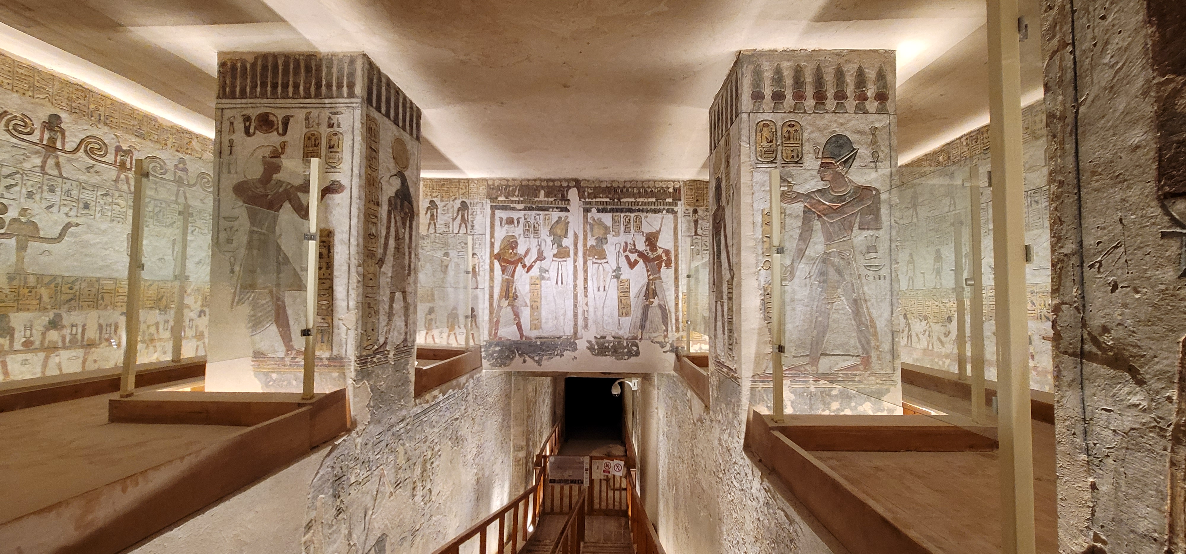 This is the second largest tomb in the Valley. It features a huge sarcophagus base in the center of the cavernous burial chamber and a well preserved cover for one of the other three smaller sarcophagus he was buried in.
