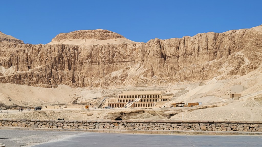 Next stop was the Mortuary temple of Queen Hatshepsut. This wasn’t used for festivals like the East Bank temples, here on the West it was host to the mummification process. Famous for its unusual design, it was built into the mountain not far from the Valley of the Kings.