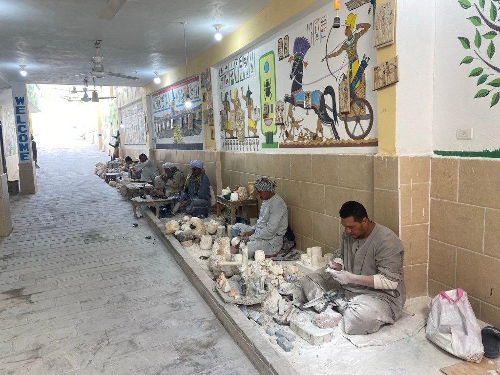 Our next stop was an Alabaster factory. Like the papyrus making and the essential oil factories, it’s a bit of a demonstration and then lots of opportunity to make purchases. But knowing that’s the deal, we enjoyed seeing how they handcraft alabaster and basalt into beautiful pieces. Suaram even volunteered to help – her tool is used the carve out the inside of a bowl before the outside is chipped/filed/sanded smooth around it.