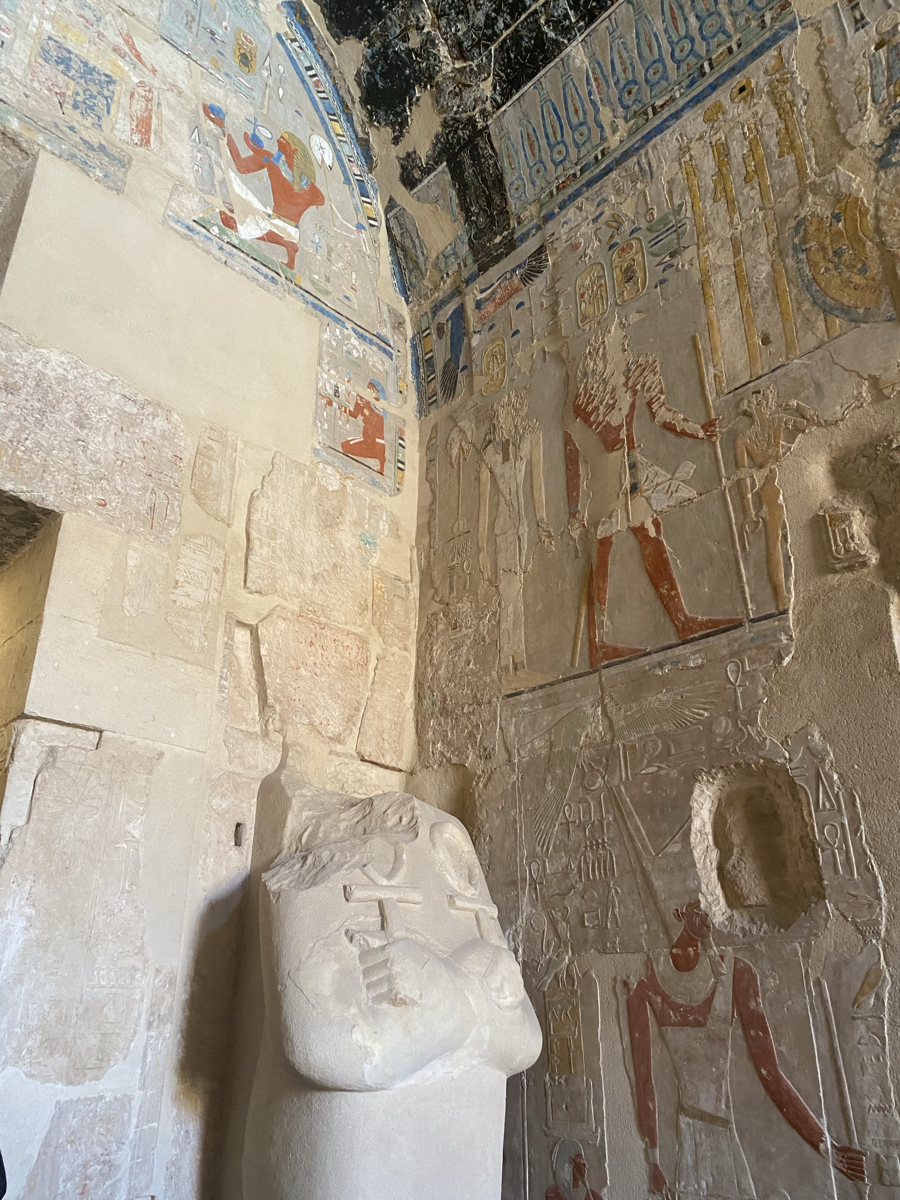 The final tomb of the Valley was for Rameses I who was only king for 3.5 years. Since tombs are built starting at the beginning of a Pharaoh’s reign and work stops upon their death, a short reign means a small tomb. Luckily the king decided to have his burial scenes painted on the walls instead of carved so it is much more complete than it might have been. And here again, the colors were stunning with a deep blue we had not seen anywhere else.