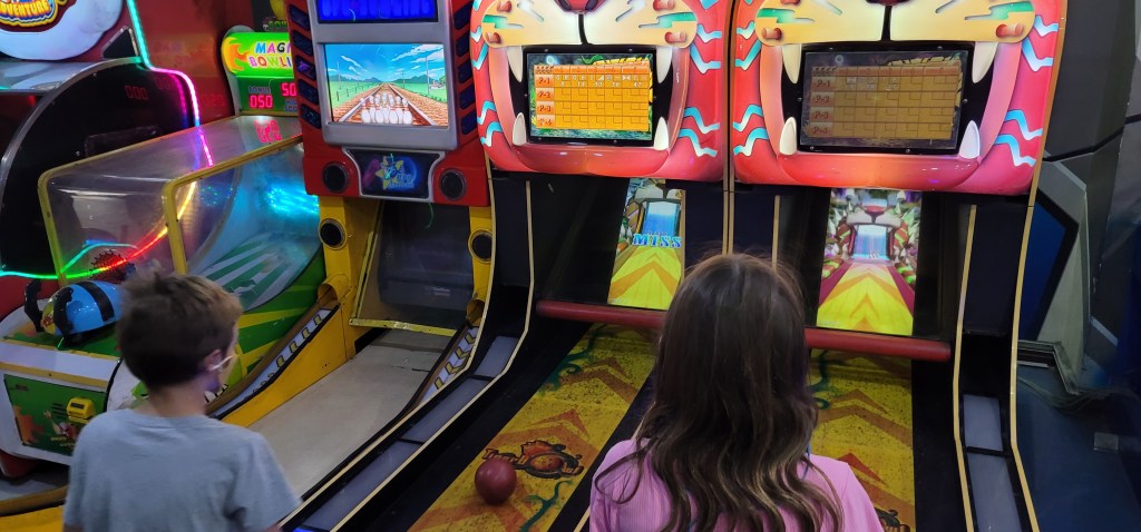 As an upgrade, the mall arcade has some basic carnival rides including bumper cars which the kids enjoyed several times. This is the first time they’ve ever done big kid bumper cars so they were excited. Dad’s back hurt just watching them.