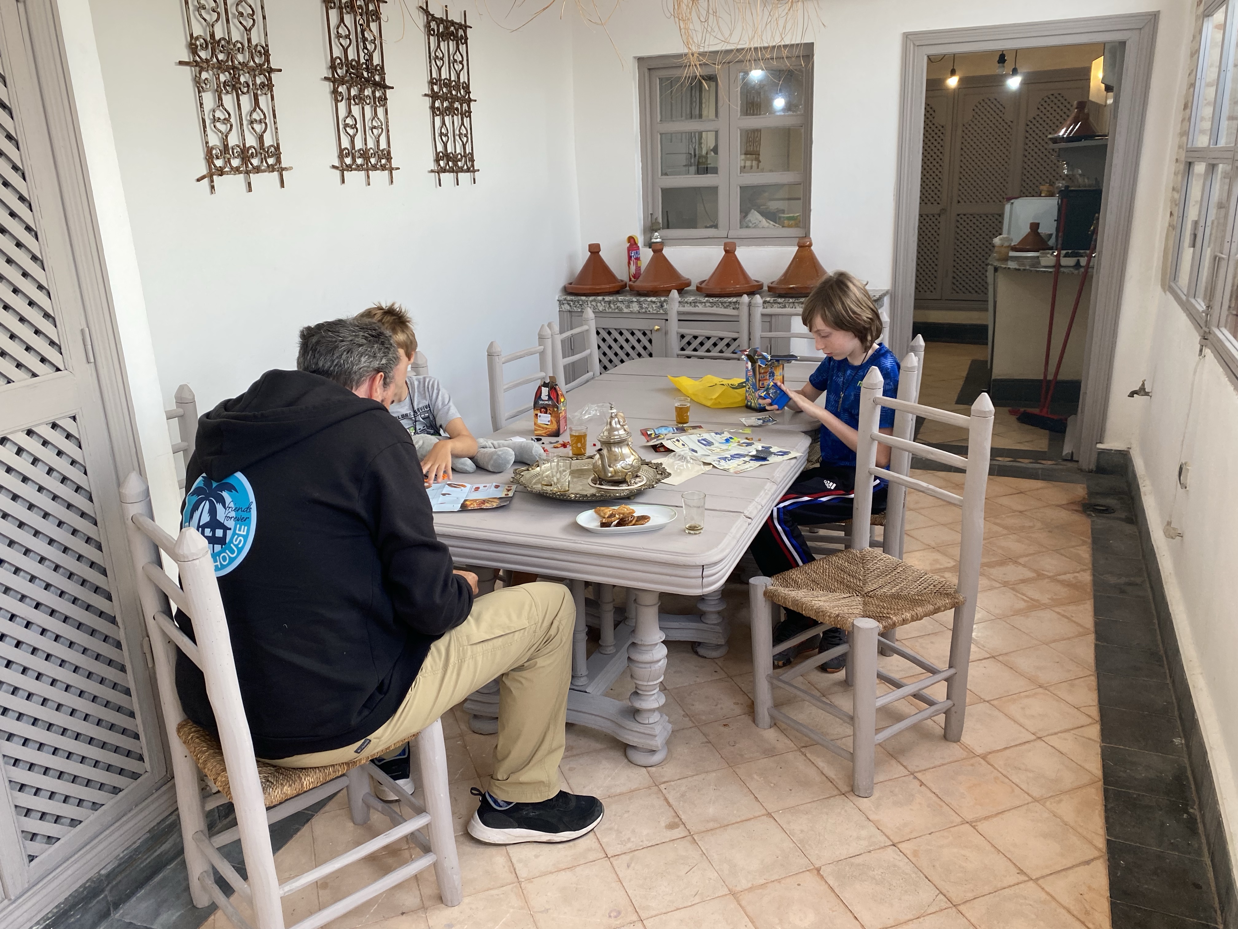 The housekeeper who met us at the van had prepared traditional Moroccan mint tea and pastries to welcome us. She then cooked a typical Moroccan dinner while we settled in to our new space and the boys built their Lego sets. The food was as lovely as the riad. We think we’ll like it here.