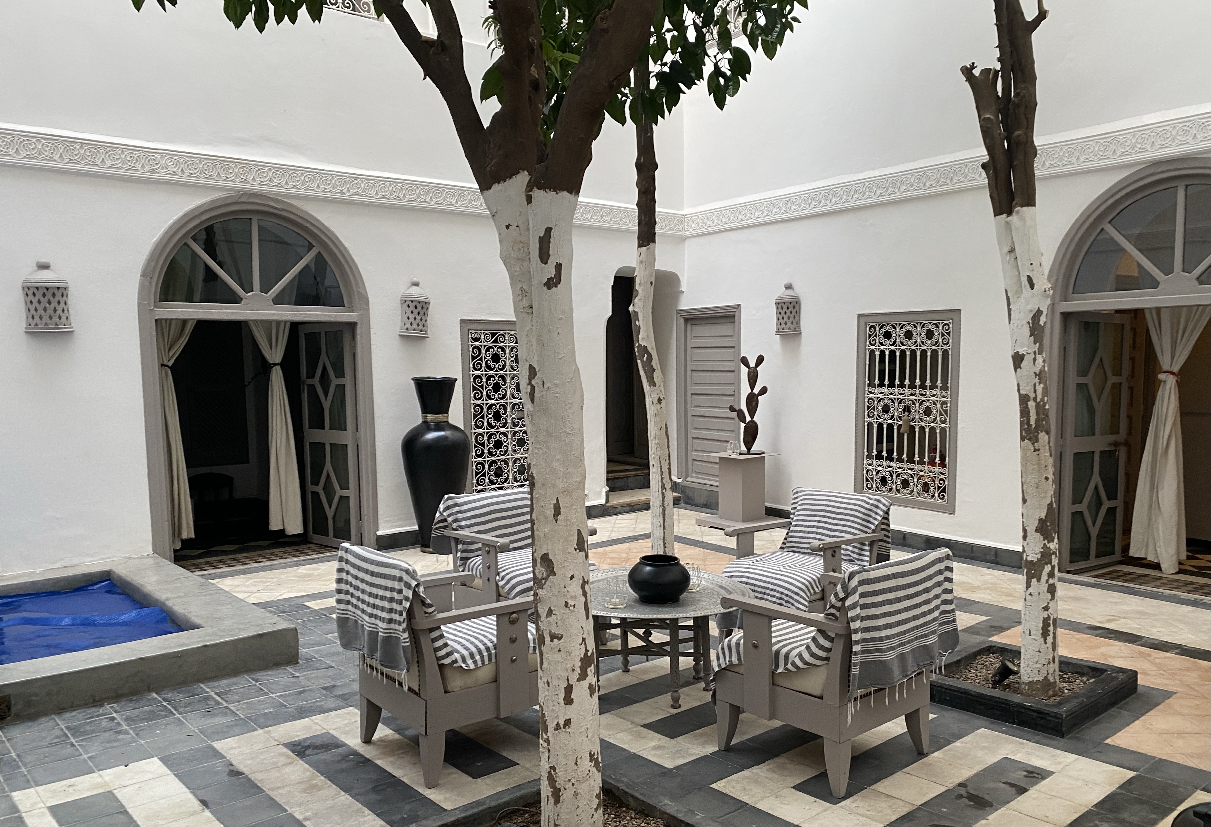 Our guesthouse is a traditional Moroccan home organized around a central courtyard known as a riad. This one has been renovated with care and is lovely, large and seems a perfect quiet spot inside the busy city walls. Like all riads, our bedrooms and baths are on the ground floor surrounding the courtyard with its three orange trees. One level up is a living area. Level three has the kitchen and dining table and at the top is a roof deck overlooking the Medina (and all it’s many satellite dishes).
