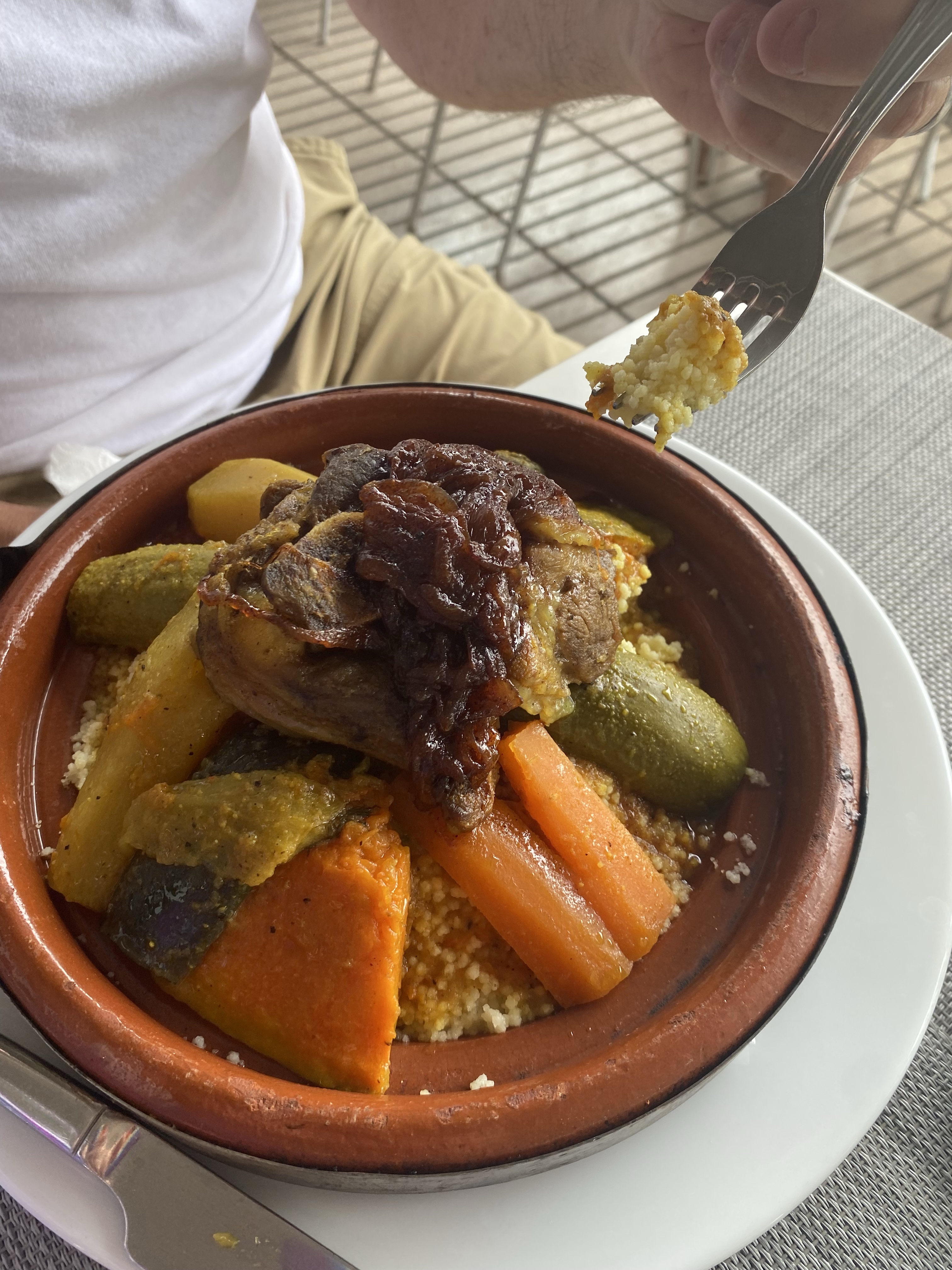 Today we enjoyed a wonderful lunch on the Jemaa El Fnaa square – the largest in the Medina. Two of us had traditional Moroccan dishes (Tagine Chicken & Lamb Couscous).