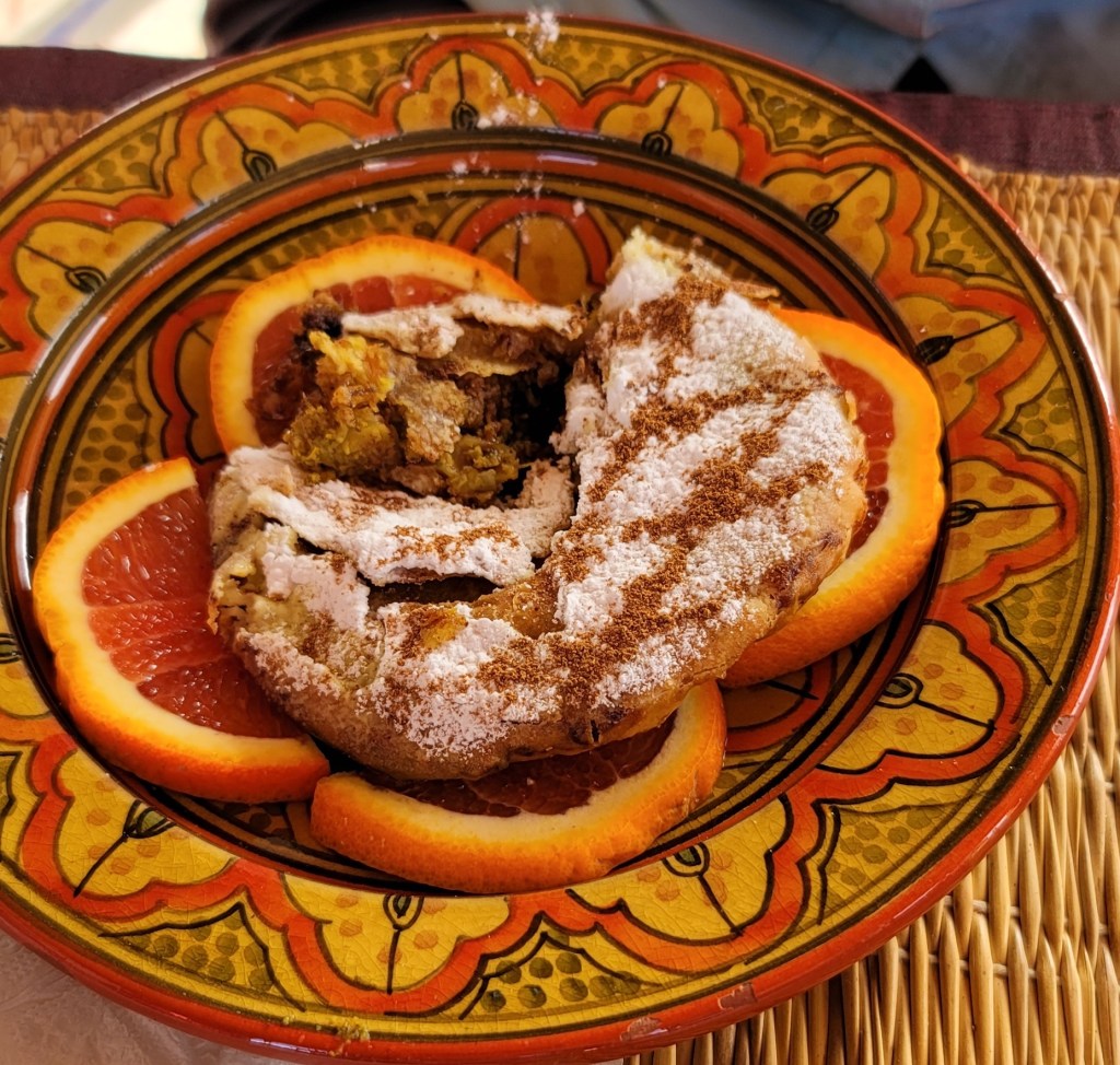 We tried another traditional Moroccan dish – this time Chicken Pastilla (sometimes bastilla) or chicken pie. We were a little skeptical on this one. It’s a blend of savory and sweet flavors – saffron chicken, omelet, spices plus almonds all wrapped in a layered pastry with powdered sugar and cinnamon. Turns out it is was one of the most complex mix of flavors Brian and Tiffany have ever tasted and it was very good (the kids declined and we were fine to let them, it was small and we wanted it all.