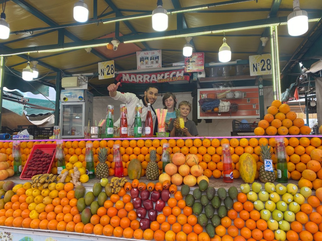 We retraced our steps from yesterday and headed back to the main square. Looking for a suitable hat and other must haves all the while. When we arrived it’s a good thing we were thirsty since there were a dozen juice stands lined up side by side all calling for our business. The guy we chose quickly put the boys to work.