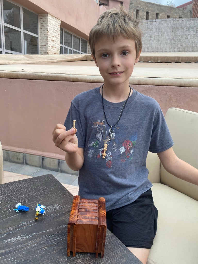 Our last purchase of the day was not a hat – maybe we’ll try for that again tomorrow – but a magic wooden box CreeperPuppy fell in love with. Like the chess sets, these are available all over the souk and he checked several places until he found the box and price he liked best.