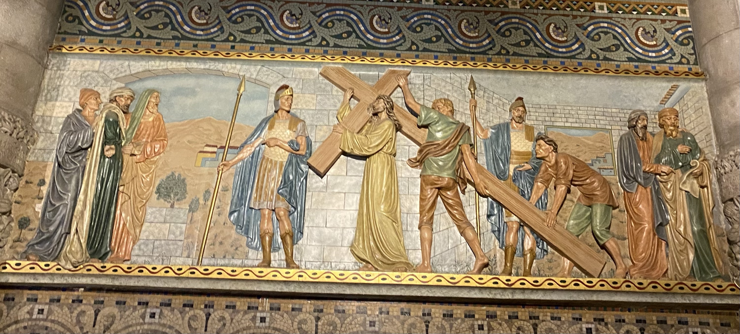 The crypt has detailed mosaics and rich sculptures on the walls.