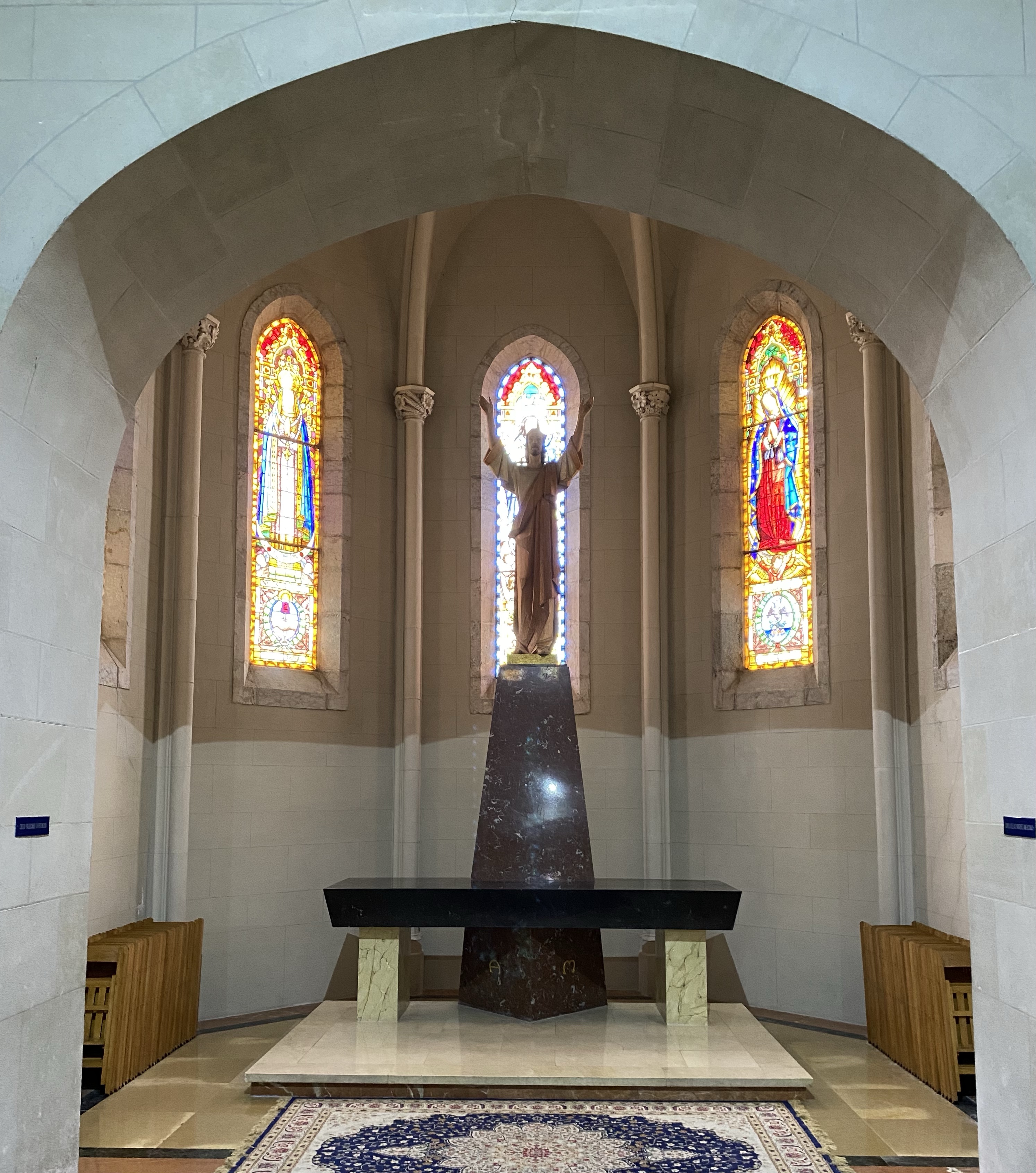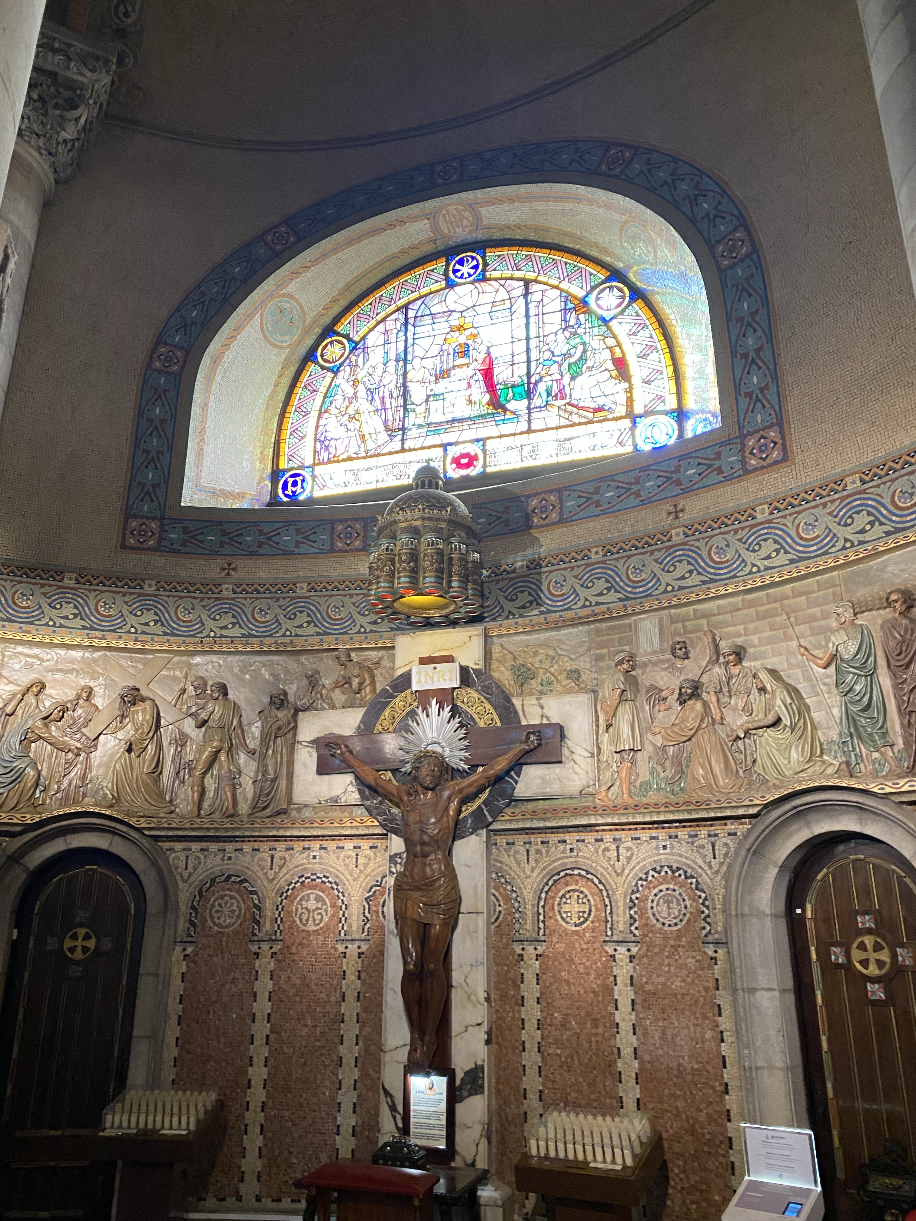The interior of the church has soaring ceiling and detailed stained glass windows.