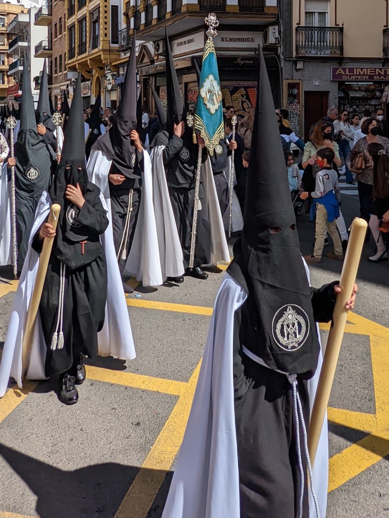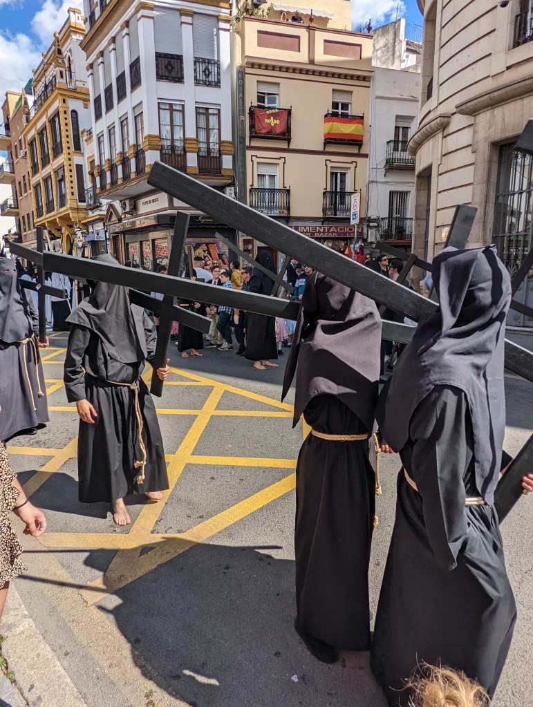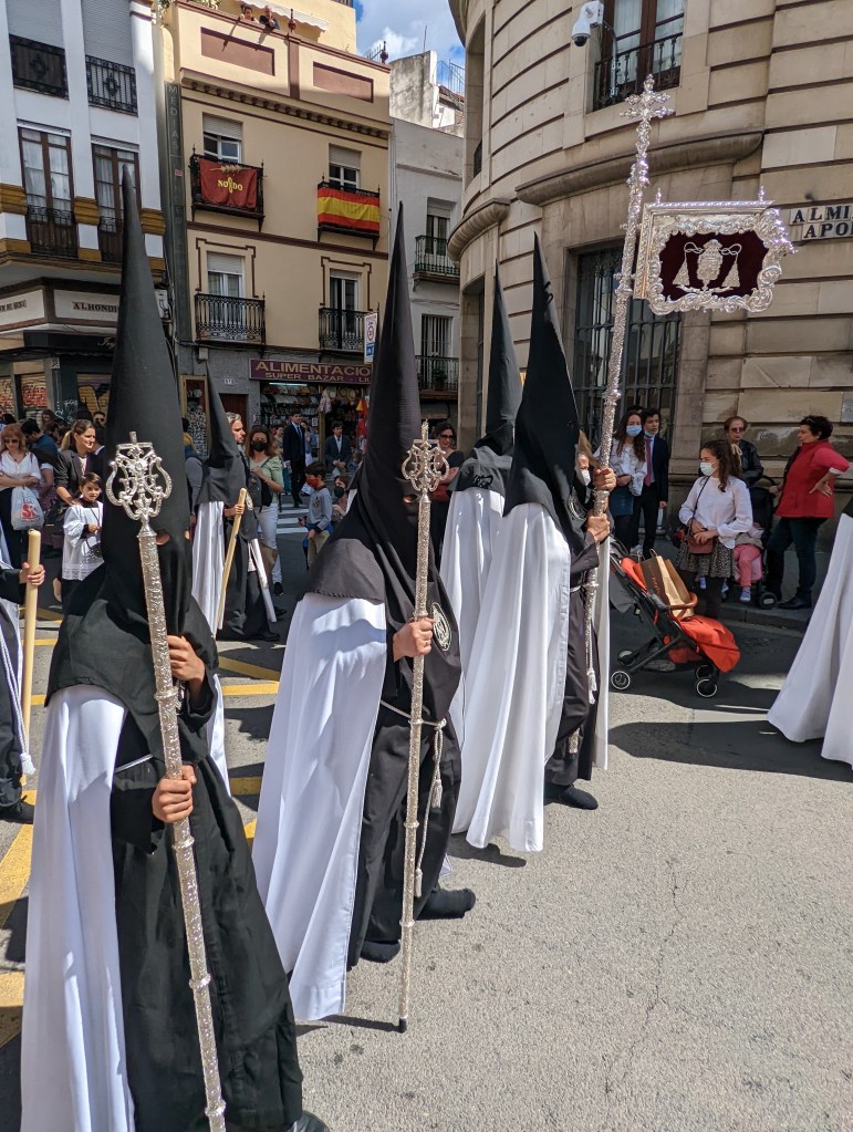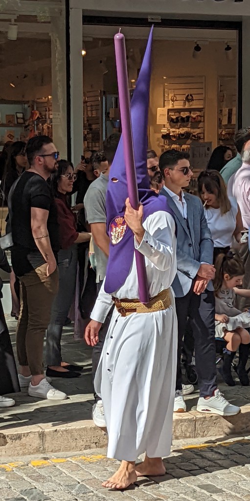 2nd – A number of people (sometimes barefoot) dressed in a habit and with the distinctive pointed hood (capirote) and holding long wax candles (only lit by night), marching in silence. These are the nazarenos. Each brotherhood has a distinctive habit.