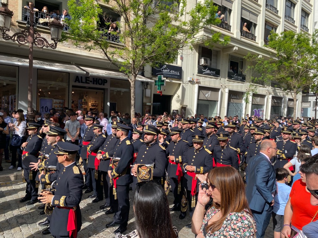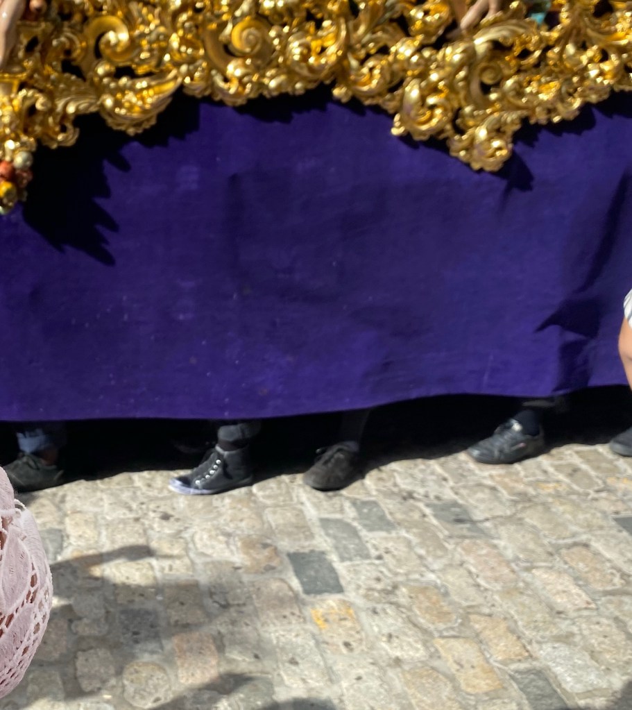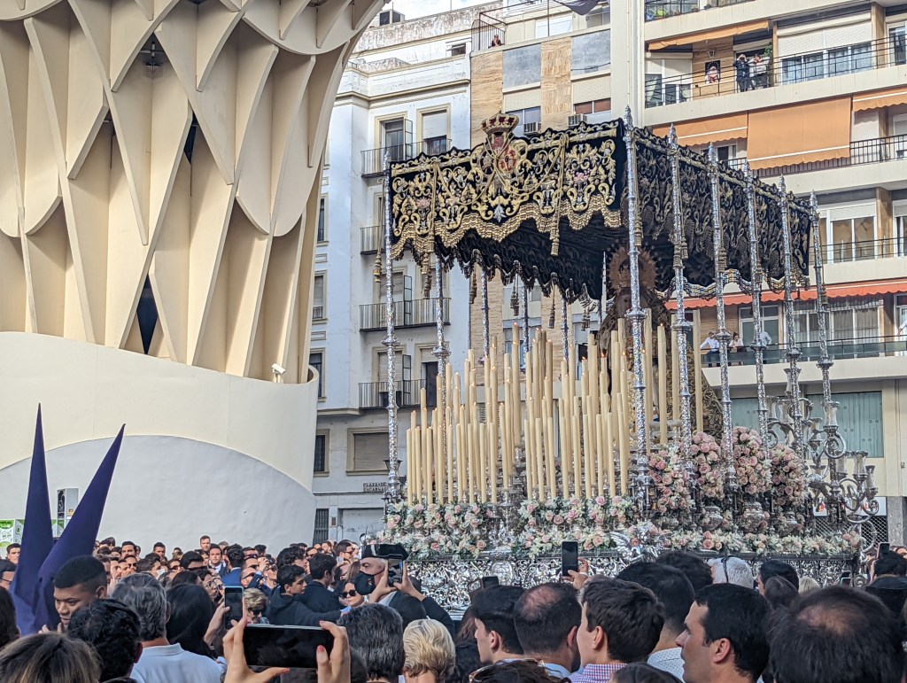 A distinctive feature of Semana Santa in Seville is the style of marching of the pasos. The costaleros– a team of men supporting the beams upon their shoulders and necks, lift, move and lower the paso. The float can weigh up to one ton so it takes 20-55 men to carry them. As they are all inside the structure and hidden from the external view by a curtain, the paso seems to move by itself. The video shows the impressive act of turning it as the procession rounds a corner.