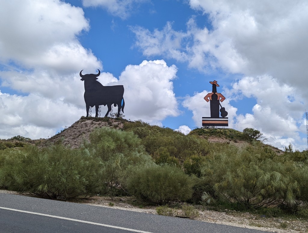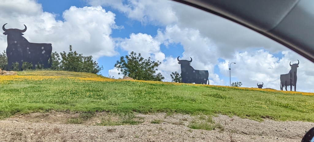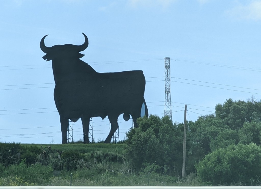 The test was several hours before her flight so she, Tiffany and CreeperPuppy headed back to Rota. Somehow Tiffany took a wrong turn and ended up heading into the town of Puerto de Santa Maria – the home of the Osborne Bulls. How did we know? Lots and lots of Bull sightings! It seemed this icon of Spain had come out to say goodbye to Tracy as well.