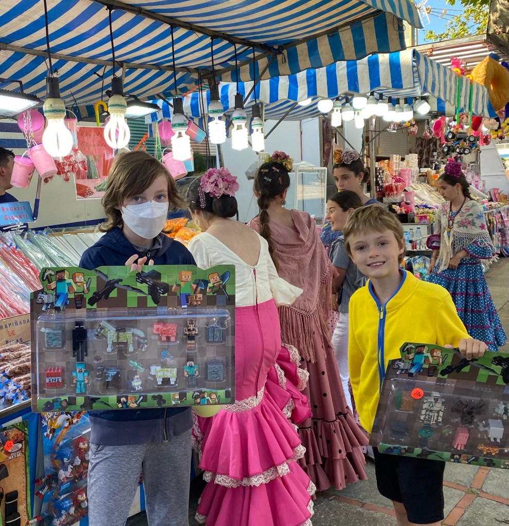 We were there on the early side from 6 to about 8pm. Apparently like Asia, Spain lives at night. We heard loud music past midnight yesterday and expect that to be the case all week. We rode some rides, ate some fried food & some treats and did a little shopping. Selling toys is another thing we didn’t recall from our hometown fair