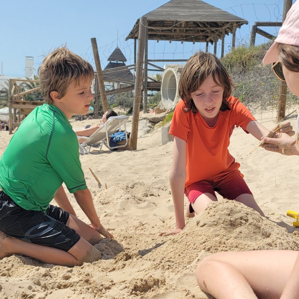 We packed a mini-cooler, a beach umbrella, some towels and toy shovels. Upon arrival, the kids were commissioned to create two adult-sized “beach chairs” in the sand which were actually both comfortable and functional. We keep thinking we’ll buy some chairs but the 25€ price tag per chair is a big deterrent for something that doesn’t fit in the suitcase.