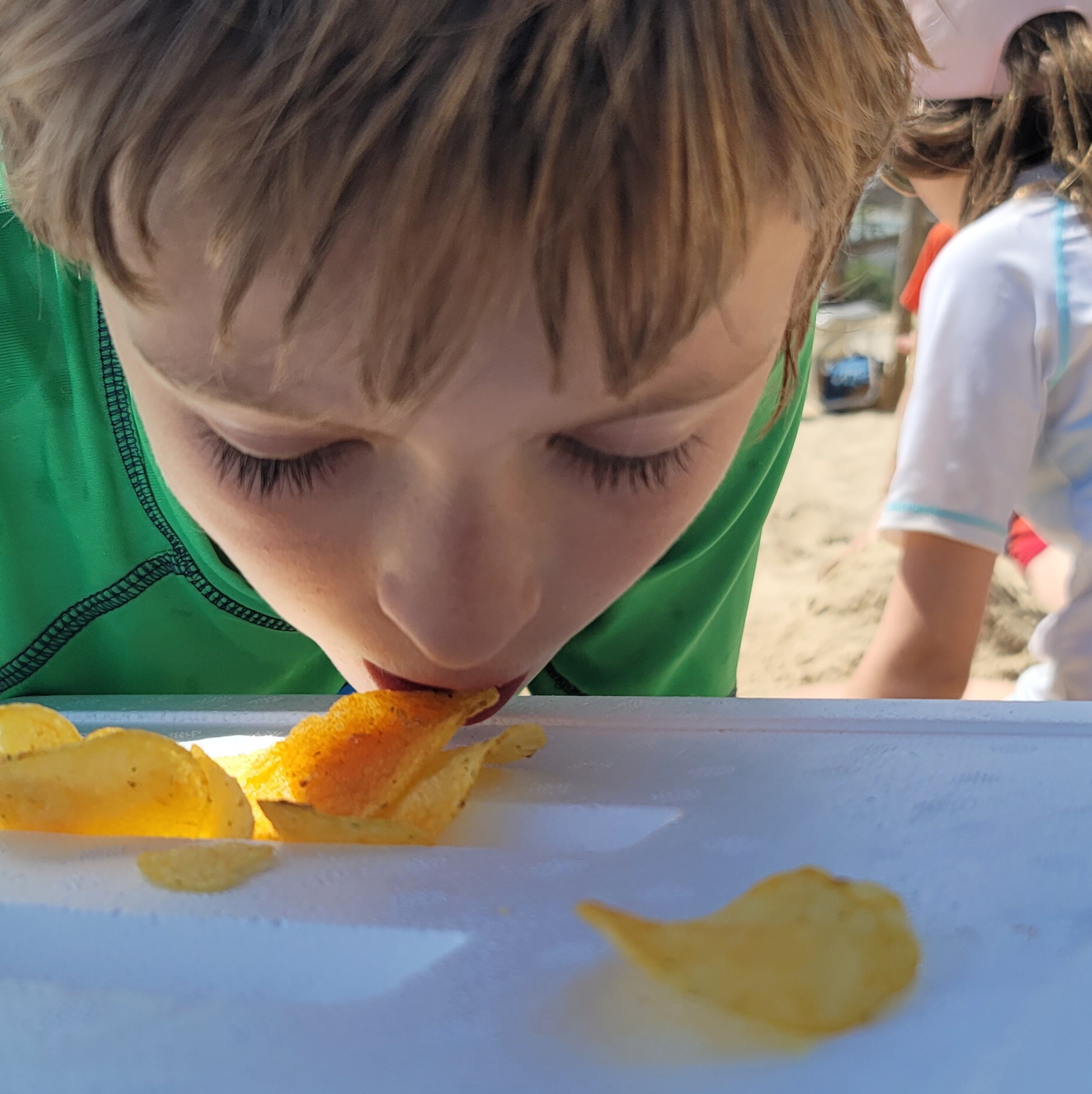We sustained ourselves with cerveza and salt potato chips. CreeperPuppy perfected the method to eat chips without using his sandy hands.