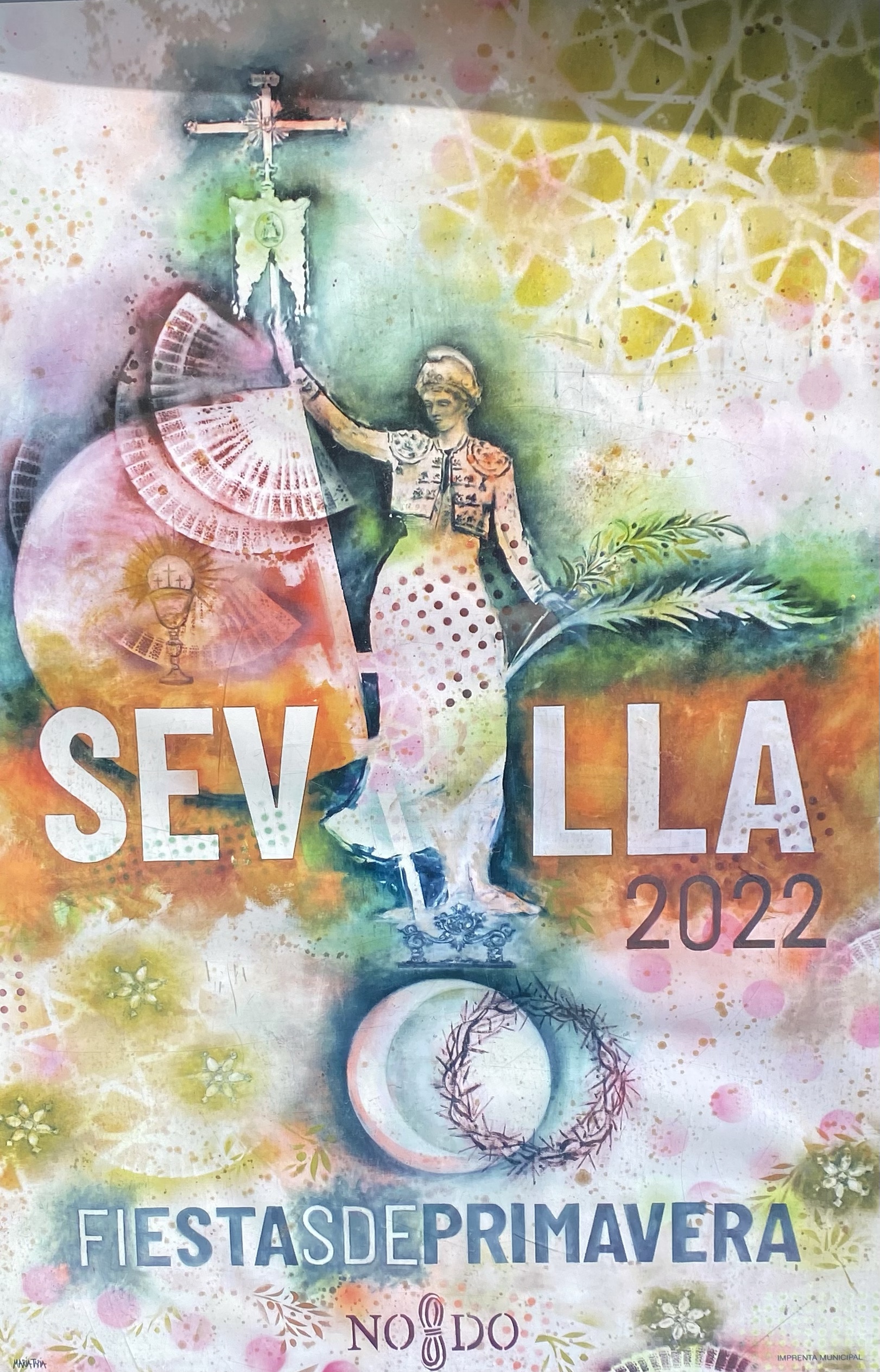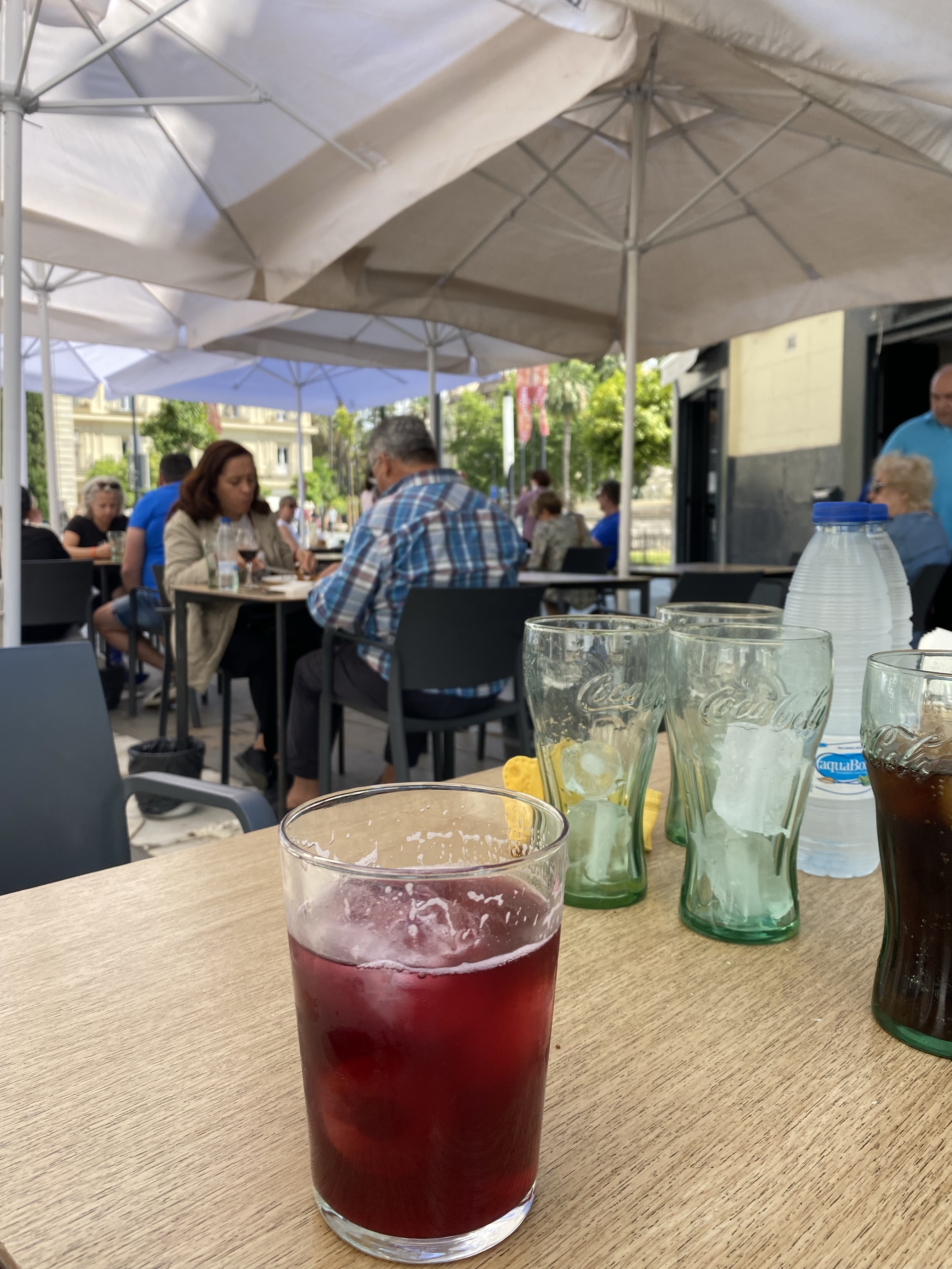After the Palace (and a souvenir peacock for CreeperKitty to take home) we stopped at a street cafe for a 4:30pm lunch. Apparently we’re adapting well to the Spanish lifestyle. It wasn’t a fantastic food experience, but the beverages and people watching were outstanding. Seville is having their own Féria de Primavera this week. We aren’t going to the Fair but we enjoyed seeing the costumes immensely.