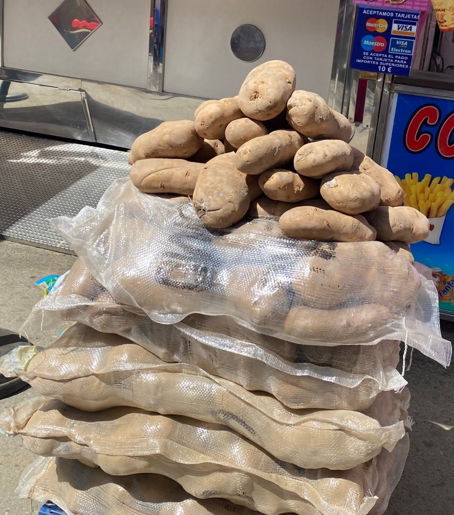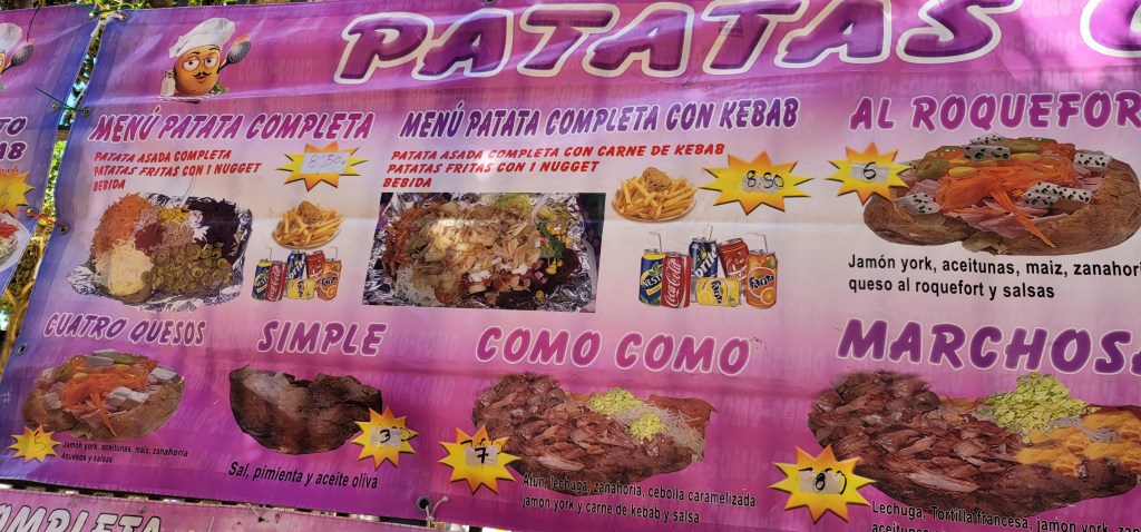 In Spain, the equivalent food for sale everywhere is – baked potatoes. Yep. But not just plain or with sour cream and chives – baked potatoes with lots and lots of toppings – in many cases ones we’ve never ever seen offered on a potato before. The como como one in the picture comes with: Tuna, lettuce, carrots, caramelized onions, york ham, kebab meat and salsa. Many come with green olives in the mix. Seems weird to these Americans but is very very popular here. Tiffany almost ordered one just to try it, but in the end chose the regular chicken kebab.