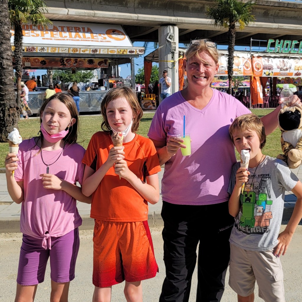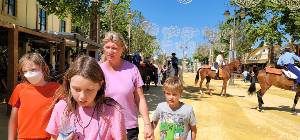 We could have sought other local foods at this second fair visited in Andalusia but the kids were eager to get on some of the rides. In Spain, there are local fair rides which might look similar to those in the US. For example, there is a ferris wheel and bumper cars here. They also have those swing chairs on long chains that spin riders in wide circles 10 meters off the ground (30 feet). This fair had a few rides that we did not see in Rota and would not have seen at most fairs in the US.