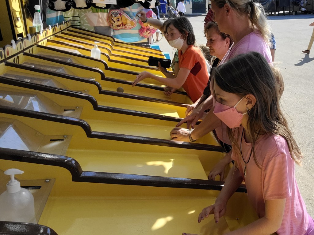 The award for the most unusual ride of the day would have to go the ride that CreeperKitty selected for the kids to go on (the adults were not at all interested in this one). It’s called the “Totem” ride and the kids mount a padded log and are jostled until they fall off. It’s kind of a bucking bronco situation but with lots of simultaneous riders it can create a fun tangled mess of bodies. Here’s a 16 second view of it.