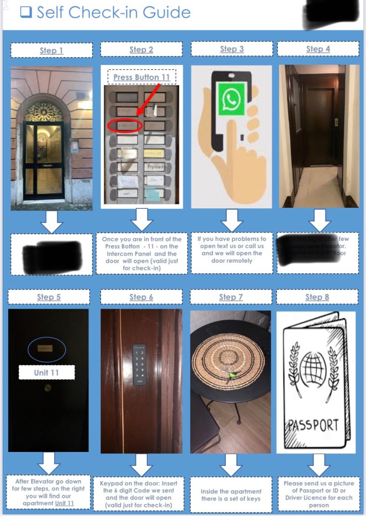 We arrived in Rome after dark so we don’t have a lot of sights to share yet. We’re staying in an apartment as we have often done on this trip. Our check-in experience was very typical but this time we got a pictograph to help us get checked in so we thought we’d share.