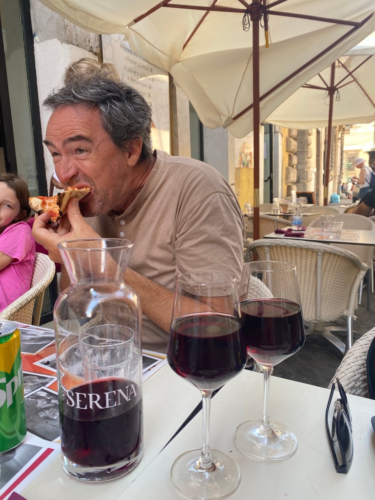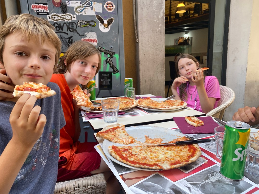 All that history made us famished! As we walked home, we ducked into an alley to a lovely sidewalk trattoria for what we fondly call ‘linner’. It’s that full meal you eat way after lunch time but eay too early to call dinner. The kids ordered pizza – which is not unusual and it might be all they eat in Italy.