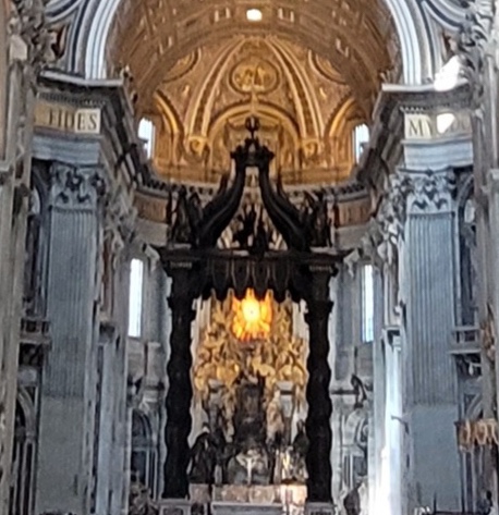 Underneath the Altar is St. Peter’s Tomb. Above the Altar is a gigantic cover or baldachin. It is made of bronze, some of which was ‘recycled’ from the portico of the Pantheon. The twisted columns are modeled after the columns on the ‘Old St. Peter’s’ built in the 4th Century.
