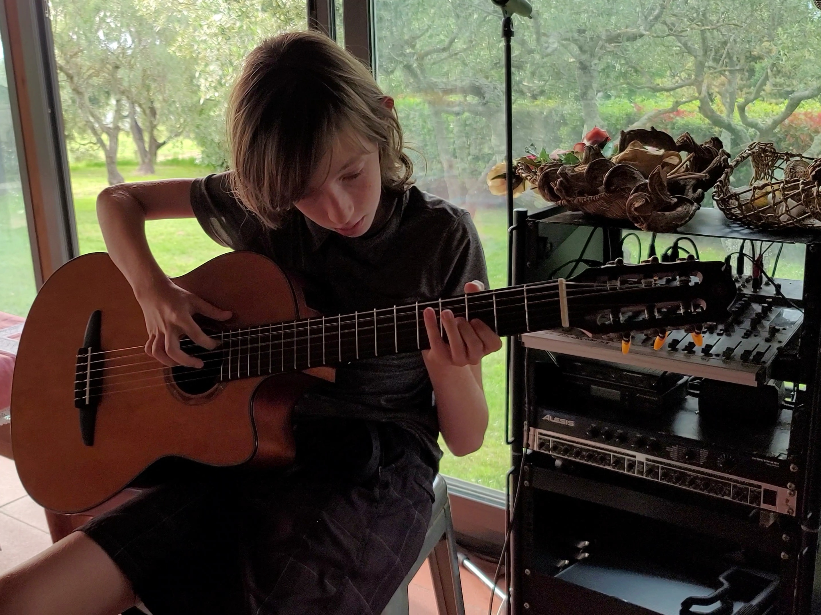 Our classroom is a well-ventilated porch room which seemed to double as a music solarium. A couple of microphones and a soundboard made clear that our hosts enjoyed making music here. They encouraged the kids’ musical interests in the gear and it wasn’t long before CreeperKitty had a guitar in his hands.