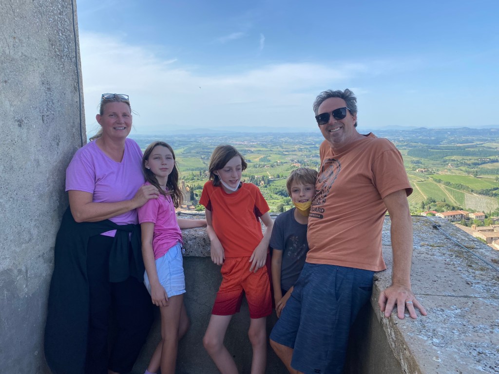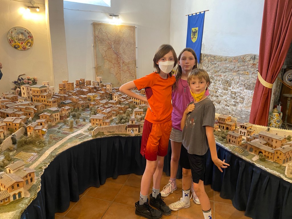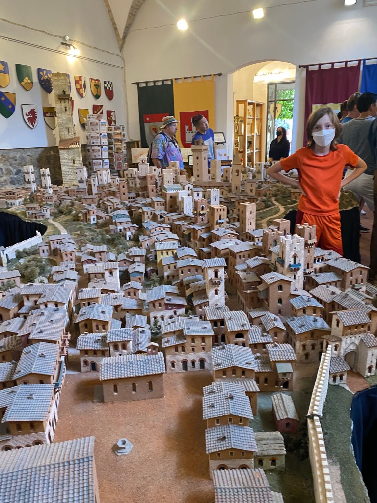 We wandered through the old gate and the narrow historic streets to a place called San Gimignano 1300. It’s biggest attraction is a ceramic recreation of the city as it existed in the year 1300. The kids love historic models and this one was fantastic, in part because it was huge by normal standards.