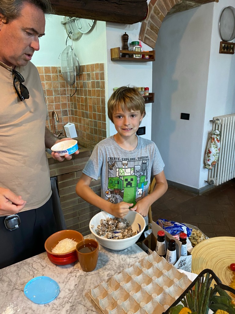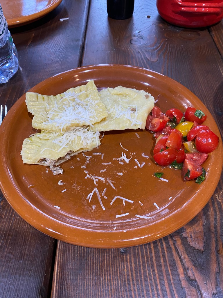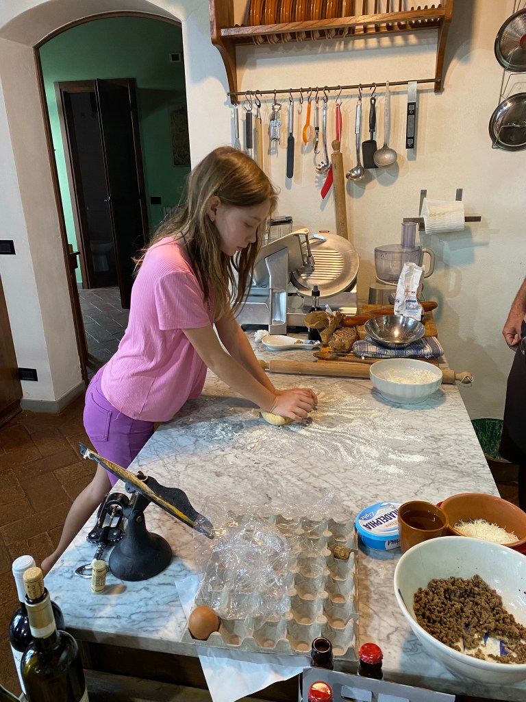 Ultimately Brian decided to return to the San Gimignano house to catch up with the others. After enjoying the view and some local wine one last time with Tiffany (we leave tomorrow) he decided to cook dinner – using the random assortment of food in the house. Flour. Half a tub of cream cheese. Some leftover taco meat. A working faucet for water. Hmmm…How about ravioli? Twice in one day!