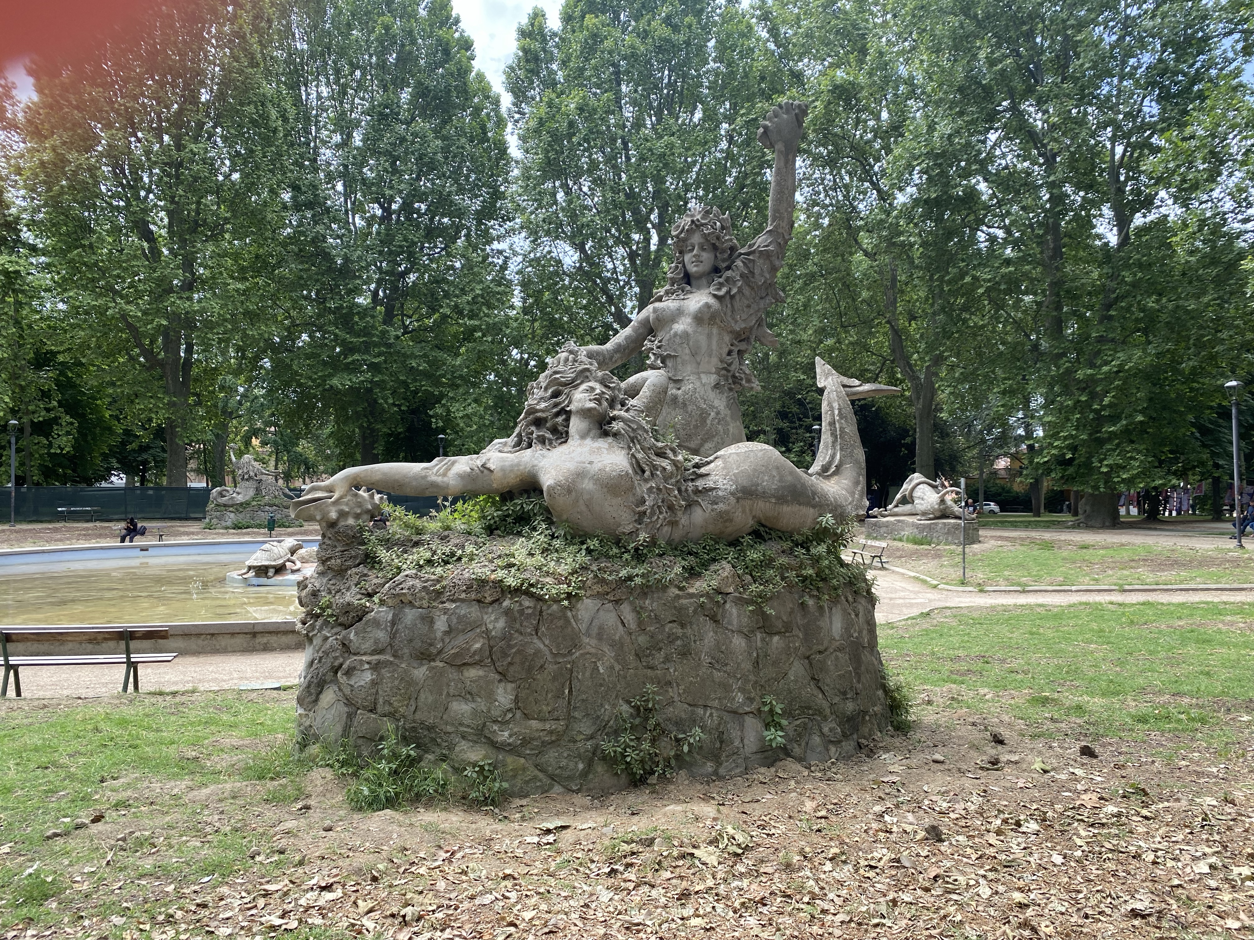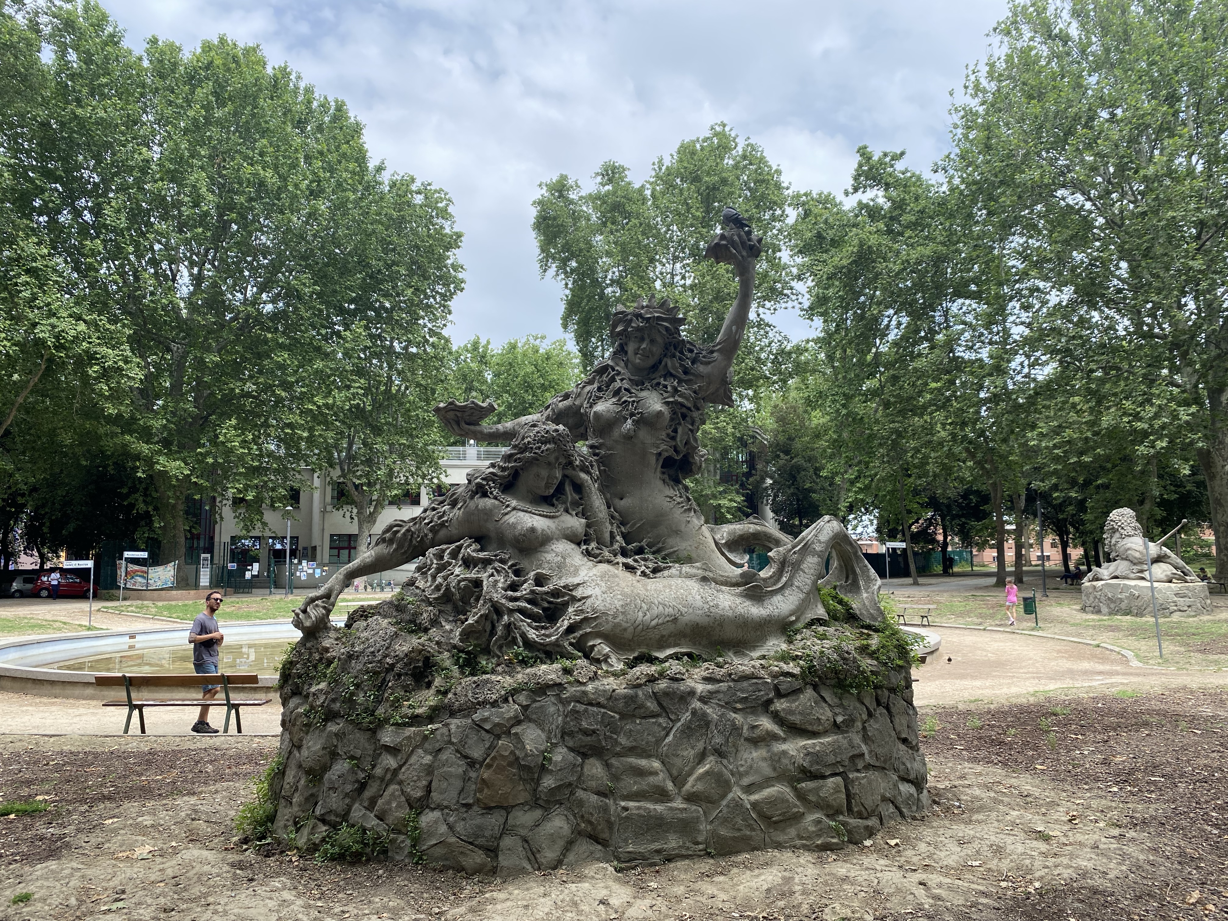 Our hopes for a cool playground were dashed but we found a very interesting fountain – more accurately the 4 statues surrounding the fountain were interesting. As a collection, they all are quite striking for the sense of violence they display. Two are of predators hunting prey and in one case fighting a snake for the kill. The others depict mermaid on mermaid fighting.