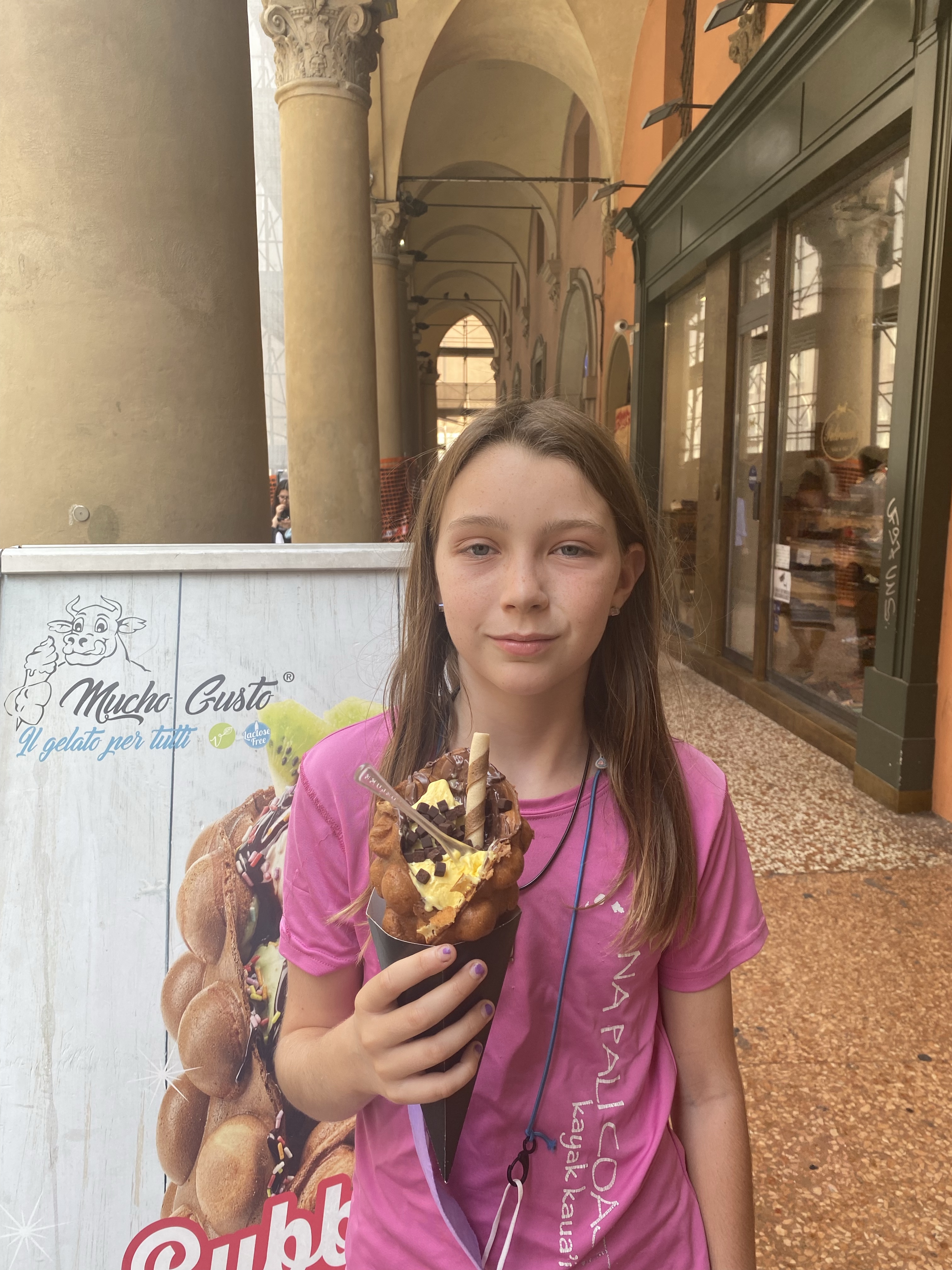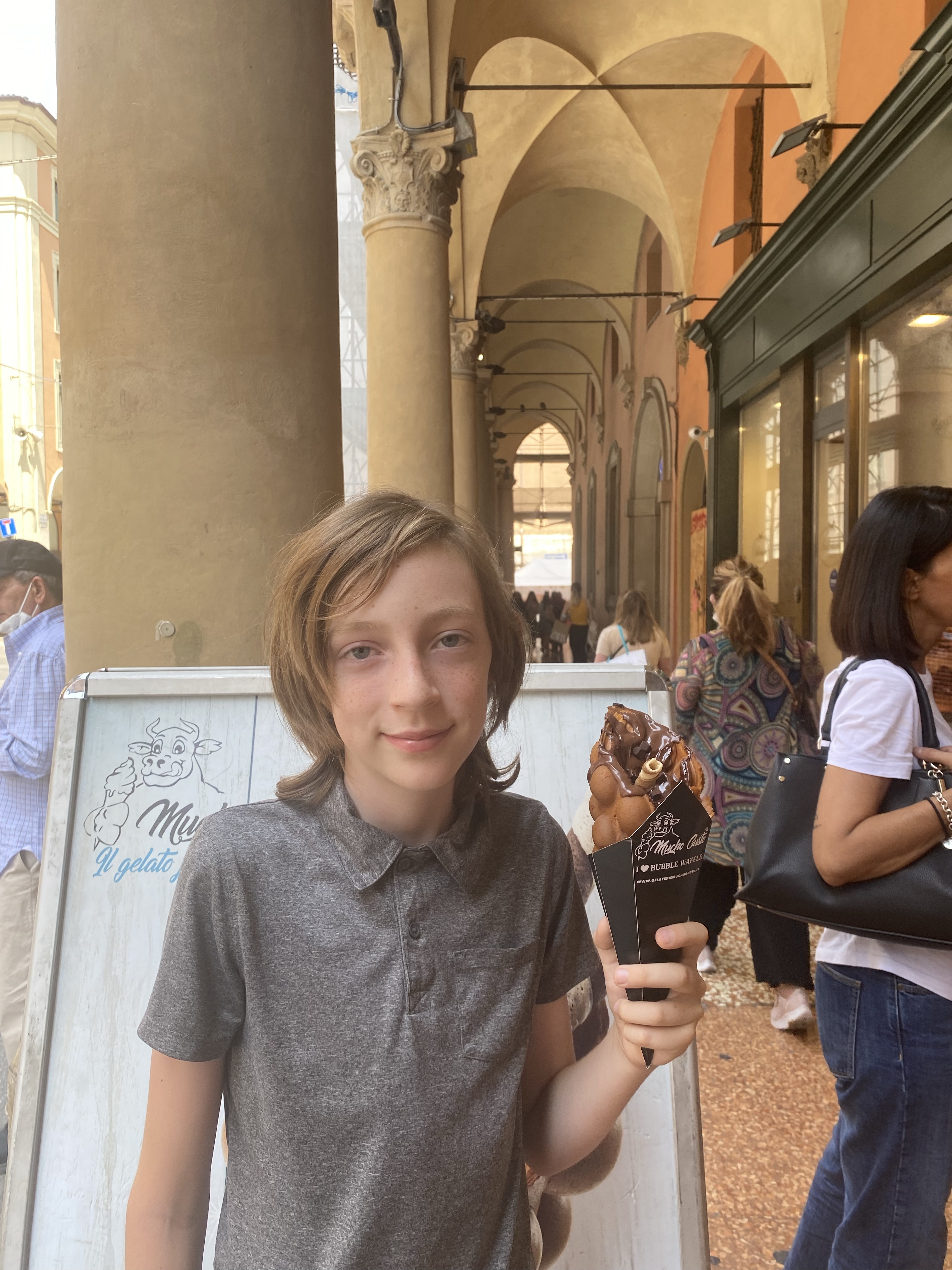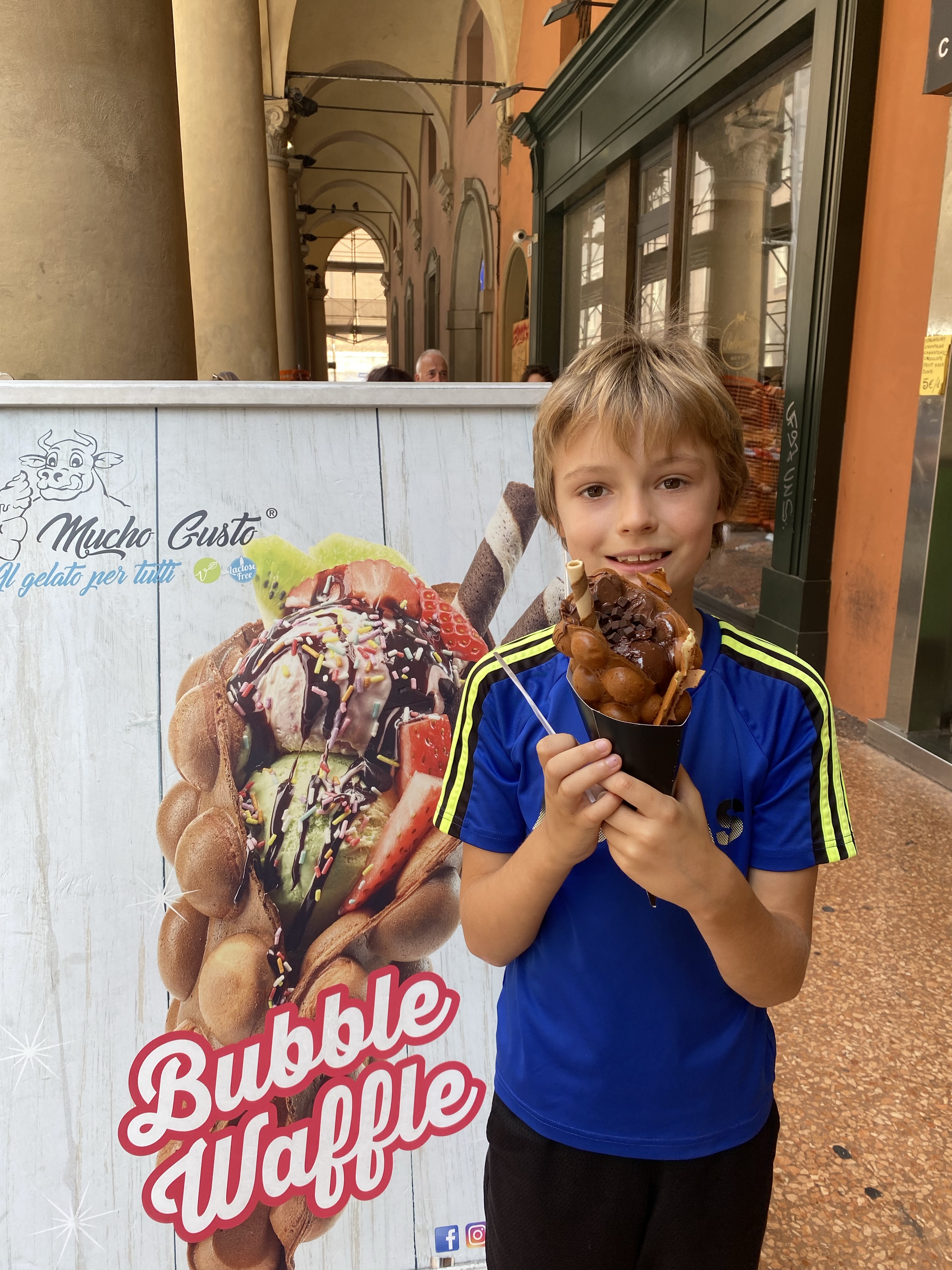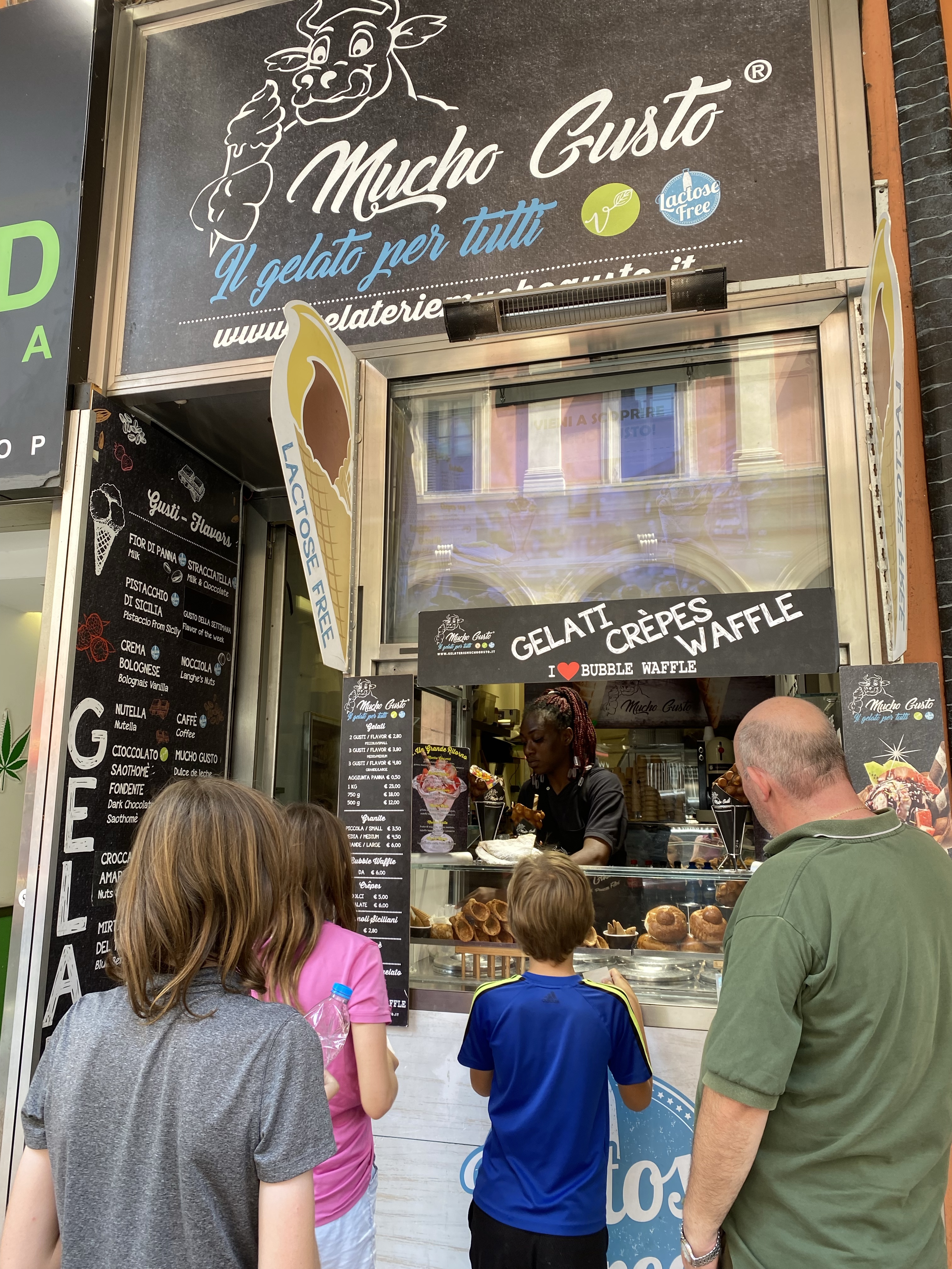 As it got time for lunch, the parents apparently lost their minds because the menu item of choice was gelato! Specifically bubble waffle cones filled with gelato. The kids had seen this confection in a previous town but hadn’t gotten to try it and, well, sometimes you have ice cream for lunch.